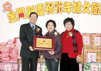 縣府昨日假縣立體育館舉行慶祝「九十六年婦女節表揚大會」活動,近一千二百位來自各鄉鎮婦女歡聚一堂慶祝婦女佳節,福建省政府主席顏忠誠、副縣長楊忠全等貴賓到場向婦女朋友賀節,肯定婦女對家庭和社會的貢獻,並頒獎表揚模範婦女。而現場也展開「珍愛女人、幸福起飛」的趣味競賽、幸運摸彩活動,中午並於餐廳舉行聯誼餐會,讓婦女朋友歡慶佳節。 由縣府婦女福利服務中心主辦,金門縣婦女會承辦的婦女節表揚大會等活動昨日上午九時許在縣立體育館展開,由婦女福利服務中心主任陳麗玉(婦女會理事長)主持,包括福建省政府主席顏忠誠、秘書長翁明志、副縣長楊忠全、縣府社會局專員黃雅芬、議員許華玉、監理所所長梁惠群、林務所所長葉媚媚,及金城鎮長蔡輝詩、金寧鄉長李文俊、金沙鎮長陳昆第、國民黨金門縣黨部主委林國平等貴賓出席,向婦女們賀節致敬。 在表揚活動開始,省主席顏忠誠、副縣長楊忠全等到場的貴賓與參與的婦女朋友大家一起手牽手隨著輕快的樂音動起來,為慶祝活動熱身,隨後副縣長楊忠全、省主席顏忠誠也頒獎表揚全縣二十位模範婦女、全國績優村里鄰小組召集人得主,並向她們賀節致意。 接受表揚的全縣模範婦女有金城鎮:許玉瓊、楊麗端、李麗輝、陸柳姑、陳碧蝦、許閱治等六位。金湖鎮:吳玉鳳、李彥瑩、黃蓮治、黎氏金艷、李開云等五位。金沙鎮:陳李龍鶴、陳玉珍、宋明黎、陳麗珠等四位。金寧鄉:李亞蓉、楊彩錦、唐玉榮等三位。烈嶼鄉:陳美珍、蔡秀美等二位。而當選中華民國婦女總會全國績優村里鄰小組召集人為現任金城鎮代表會代表張含麗。 陳麗玉除感謝婦女姊妹的踴躍出席參與,也謝謝縣府補助經費及各單位贊助彩品,伴同婦女朋友歡度婦女佳節。她並以「女人幸福、大家幸福;女人心痛,天搖地動」來形容婦女對於家庭社會乃至於國家的重要性。 副縣長楊忠全指出,根據金門縣政府九十六年二月份的統計,金門縣總人口數已達七萬七千四百七十七人,全縣戶數則為二萬八千六百二十六戶。男性人口數比女性人口略多出一點點,這也顯示女性重要性。 依據縣府統計,金門的大陸新娘已超過八百人,外籍新娘已逾四百多人,且隨著小三通的愈來愈便利,大陸和外籍新娘在金門有增加的趨勢。 他也提到地區三代同堂比率比台灣多,家庭和諧。他也感謝地區各婦女團體的協助推動,讓地區的婦女可以吸收更多新知,自我成長。縣府未來加強與地區的婦女團體相結合,為地區的婦女服務、兒童教育、新移民人口做更完善、全面的服務與照顧。 顏主席致詞也向婦女鄉親表達最高的敬意,祝大家「心想事成、萬事如意」!他說,女人撐起半邊天!婦女是家庭的重心、安定社會的力量。 他表示,以前在軍中對於同事能娶到金門的女子作老婆都會誇讚他說「你真行!」,隨著社會的變遷,近年來地區的新移民女性也越來越多,也希望大家多給予協助,讓他們很快能融入金門家庭,讓每個家庭都幸福美滿。 而包括各界首長提供、贊助的豐富彩品也讓昨日的摸彩活動更是內容充實,如:特獎有福建省政府主席顏忠誠提供的電冰箱、金門縣議會議長謝宜璋提供的電視機、及金門國家公園管理處處長黃文卿提供的洗衣機。另頭獎有縣長李炷烽提供的自行車一台,金城鎮公所、金城鎮代表會、身心障礙者家長協會、盈春閣餐廳各贊助一台自行車及各界首長提供的「首長獎」,主辦單位也準備的電烤箱、開飲機、棉被、小家電、床組、羽絨背心、背心等,大手筆的彩品再加上中午在盈春閣舉行的婦女節聯誼餐會,讓參與婦女臉上綻露出開心的笑容。(相關新聞刊第二版)