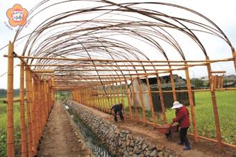黑羽白紋的八哥鳥,群飛群落;黃花綠莖的油菜花,齊搖齊擺。春風春雨中的新前墩,不但有鳥語花香,還多了用孟宗竹做成的竹屋、竹亭、竹廊、竹牌、竹鈴,到處是風聲竹韻,清音悅耳。 努力追逐六星計畫的新前墩社區,自從建構了高粱草人花園之後,又引進了大量的孟宗竹,搭起了竹結構的生態建築。每一座竹屋、竹亭、竹廊、竹揭示牌,都配了「而」字狀的竹排鈴,或是「吊」字狀的竹環鈴。「鏗鏗、梆梆,叩叩、瑯瑯」的撞擊聲,遠近相和,隨著春風,敲出了新前墩的天籟。這些竹結構建築,都是新前墩請專家指導,然後運用社區的人力,動手做出來的。 從多年國小往新前墩,可以看到成片的油菜花田。田中矗立著高竿的揭示牌,上面寫著「田園遊戲」。 揭示牌通體是竹子做成的,樣子長得像「介」字。頂端是竹條編成的梯型斜頂。兩根長竹之間,用圓圓的竹篩,漆上「田園遊戲」四個字。 田間通往墩湖的溝瀆,原本是用來灌溉的,如今則用上百根竹子,在溝堤上排成兩列,搭起了瓜棚;在社區中,有人稱它為「西瓜竹廊」,也有人叫它「西瓜隧道」。只要時候一到,西瓜竹廊的周邊田地,就會變成西瓜田;竹廊上則會攀爬各式各樣的瓜類,但會以胡瓜為主。 西瓜竹廊與田園遊戲揭示牌隔著道路相對。西瓜竹廊與「清亭蜻蜓」(新前墩十二景之一)之間,則有「天堂鳥流籠」。流籠原本是渡河的滑輪,或是山區中的運輸工具,後來變成遊樂設施。新前墩的流籠,是做成天堂鳥的造型。一釘、一木都是由社區及永續就業人力所做出來的。 在揭示牌與「幽幽古厝」(新前墩十二景之一)之間,是新前墩新規劃的焢窯及烤肉區。焢窯是用紅土磚及田土築成的,一切都是就地取材,並且是以社區的人工成就。紅土磚是以木板為模子,印成長方體,晾曬一周而成。在豬年春節期間,有幾百人次來這裡來烤肉,人多火紅,連窯都給烘裂了,不過很快就又被修補好了。在土窯和土灶旁,有兩棟竹屋;其中一棟有竹几,几上可以泡茶;把几上的竹板掀開,底下有烘爐,可以圍爐烤肉。 在東關廟與清亭之間,則有三棟竹屋和三座竹製的盪秋千。竹屋的斜頂,是將竹子縱切,並從中剖開,再上下交疊;每一個斜面,大約用了六十根竹子。竹屋的柱子,直徑約六指節長;每根竹子約十來節,每節約三根指頭長。 除了竹屋(亭)、竹秋千、竹風車、竹鈴之外;新前墩的十二景,也多了竹製的指示牌。 新前墩所採用的孟宗竹,別名江南竹、毛竹,可以做為工藝材、造紙、農具、食用、建築、編織。這些竹結構的生態建築,是新前墩社區為了推動六星計畫的景觀計畫而做的,未來幾個月,還會有更多的竹構建築在這裡出現。