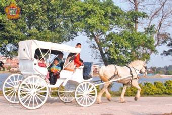 「卡通」拉馬車載民眾遊榮湖!今年畜試所迎新春活動首見馬車遊園活動,訓馬師曹復評昨進行馬兒(卡通)拉馬車訓練,讓民眾率先體驗乘馬車遊榮湖。首次搭乘馬車的小朋友均十分高興,並一再排隊乘坐;從台灣來觀光客見到馬車也表示,若是觀光活動之一,也願意試試看不同的體驗,相信這項服務對金門觀光景點有加分作用。 縣府「96年度迎新春農業展」活動,畜試所除規劃「2007揮別旺狗迎接金豬巡禮活動」,並推出各項玩樂、美食品嚐,新推出馬車遊園體驗,受到鄉親熱烈反應。 據統計,從初一至初三約有七百人次搭乘,反應良好,而昨日該馬車也從畜試所在訓馬師曹復評、李柳梅等引導下,回到自己的窩,並於榮湖展開訓練,吸引路過民眾目光,紛紛拿起相機拍照,馬車頓時成為觀光寵兒。 地區飯店業者金沙假日大飯店為了讓金門觀光有不同的體驗,特別自彰化引進兩部馬車,造價約八十至九十萬元,運抵金門約一個多月,農曆初一至初三因配合活動於畜試所曝光,受到民眾的喜愛。 訓馬師曹復評表示,兩匹馬名為「卡通」、「金莎」為比利時進口,過去在彰化即是專門拉馬車用,年齡為八歲,個性十分頑皮。他也說,自已擔任訓馬師近七年的時間以來,駕馭好馬匹最首先的工作是培養感情。 而綽號小曹的曹復評談及會成為訓馬師表示,小時候有一度到彰化某牧場遊玩,乘坐馬車觀光即喜歡上馬車,因此他十三歲就因為興趣開始學拉馬車,在學會拉馬車之前先要會騎馬,並且要和馬兒培養感情。 跟隨「卡通」、「金莎」兩匹馬到金門來,他說,想到不同的地方走走看看,到金門除了訓練兩匹馬外也負責教育訓練其他訓馬師,金門的觀光需要點刺激,相信以金門這麼美的環境,交通情況也許可,乘坐馬車遊榮湖、畜試所等觀光景點是非常好的觀業噱頭,也會帶動年輕觀光潮。 另一位訓馬師李柳梅也說,拉馬車除了訓練的溝通暗號以及專業術語外,首要與馬培養感情。 而據金沙假日大飯店表示,未來將會結合地方觀光,進行遊園、遊湖活動,除了服務飯店的觀光客外也提供民眾搭乘,目前規劃遊榮湖、金沙水庫等,進一步將配地方觀光規劃,與景點結合,推出活動供民眾體驗。 目前推出時段為上午九時至十二時,晚上九時至十時,此外,也將規劃傳統喜慶迎娶等內容,讓年輕一輩民眾體驗古禮。 昨日下午,曹復評正於榮湖訓練「卡通」拉馬車,沿路吸引民眾以及觀光客的目光,紛紛停下腳步觀賞並拿起相機拍照。並讓民眾率先體驗乘馬車遊榮湖。 小朋友看到十分漂亮的馬車為之瘋狂,於馬匹訓練期間不斷排隊等候搭乘並表示,很棒的體驗,要將第一次搭馬車的經驗寫在寒假作業「春節活動」裡面;另外也有小朋友表示,太棒了! 不少騎車、開車路過的民眾也表示,在金門地區十分少見,若未來配合地方觀光提供馬車遊園服務,他們一定要嚐試看看,相信金門好山好水空氣好一定會是不錯的體驗,即使收費也同樣會坐坐看,畢竟過去沒有機會,而且訓馬師也將馬控制得很好,很專業,所以很放心。