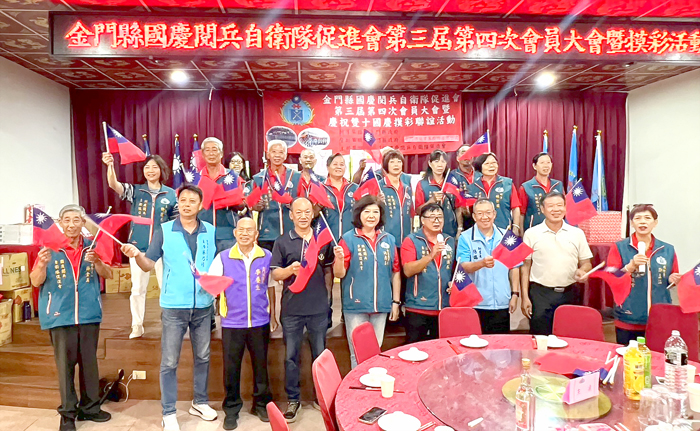 金門縣國慶閱兵自衛隊促進會昨天(10月10日)於金湖鎮紅龍餐廳舉辦慶祝114年國慶暨第3屆第4次會員大會。國慶日堪稱自衛隊促進會的生日,所以選擇每年國慶日舉行會員大會,今年輪由金湖服務處承辦。 會員大會於10月10日上午9時召開,流程包括報到、大會會議、理事長及貴賓致詞、會旗傳承(由金沙服務處接棒)、合唱〈中華民國頌〉、大合照、聯誼餐會與摸彩活動。 應邀出席會員大會的來賓包括金門縣副縣長李文良、秘書長張瑞心、金門縣議員王國代、李養生、金湖鎮代會主席蔡乃靖、前金湖鎮長蔡西湖、精忠衛隊代表等。 身為民國64年國慶閱兵金門自衛隊員的李養生議員建議,應爭取國慶閱兵隊員取得榮民身分,以便有老年就養或免費就醫等權益,蔡西湖表示認同。自衛隊促進會創會理事長洪燕玉也報告說,爭取閱兵自衛隊員取得「榮民」身分,是該會成立的訴求宗旨之一,這也是自衛隊員的榮譽表徵。此事曾委請陳福海、楊鎮浯、陳玉珍立委爭取過;前天陳玉珍立委參與閱兵隊員夜行軍活動時,再次表達她會盡力促成閱兵隊員納入「榮民」之議。 促進會張德泰理事長強調,會員大會結合雙十國慶舉辦,除彰顯自衛隊精神,也是促進情誼、傳承榮耀的重要時刻,感謝理監事等會務幹部群策群力,促成活動圓滿順利。 此次雙十國慶會員大會及系列活動,除延續歷年傳統,更在細節上加強聯繫與動員,藉9日的夜行軍傳承其信念與行動力。 民國103年3月22日,在洪燕玉、洪國泰、李文理、許玉華、許孟涵、林金豆、許幼數、洪秀鳳等昔日閱兵自衛隊員熱心奔走下,成立「金門縣國慶閱兵自衛隊促進會」,重新開啟失落的「閱兵魂」,迄今已找回五百多位隊員歸隊入會。