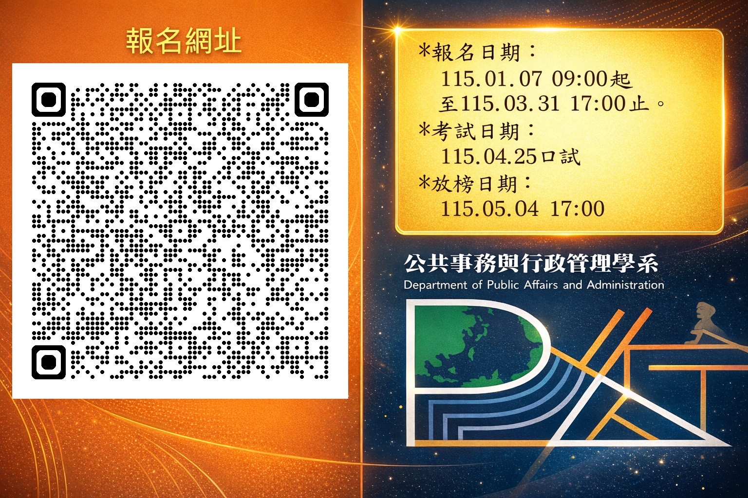 銘傳大學公共事務與行政管理碩士在職專班115學年度連江、金門班招生中,報名自115年1月7日9時起至115年3月31日17時止,銘傳大學歡迎符合資格之金門地區公務人員、教育人員及公共部門相關從業人員踴躍報考,考試詳情可參閱招生報名網址:https://reurl.cc/QVkd09。 銘傳大學指出,為強化離島地區公共治理能量,銘傳大學公共事務與行政管理碩士在職專班115學年度連江、金門班正式啟動招生。該專班以「在地治理深耕,培養離島公共專業人才」為核心理念,並強調「工作進修兼顧,打造公共事務專業新視野」,廣邀金門地區公務人員、教育人員及公共部門相關從業人員踴躍報考。銘傳大學也指出,銘傳公共事務與行政管理學系長期關注地方治理與公共政策發展。課程設計兼顧理論與實務,涵蓋公共政策分析、公共人力資源管理、行政管理實務與地方治理等專業領域,可協助在職人員將工作經驗轉化為研究成果,提升政策思辨能力與行政管理效能。同時也透過在地開班模式,讓公教人員能在兼顧工作與家庭之餘,能完成學位進修,為職涯發展與升遷加值。 銘傳大學公共事務與行政管理碩士在職專班115學年度連江、金門班,自115年1月7日9時起至115年3月31日17時止報名,訂於115年4月25日辦理(口試),預計於115年5月4日17時放榜。有意報考者,可至招生網址:https://reurl.cc/QVkd09或掃描QRcode(如圖)查詢詳細報名資訊;亦可參考招生影片https://youtu.be/cDzAB-_0X0M,了解課程特色與學習環境。 銘傳大學公共事務與行政管理學系也表示,離島治理議題多元且具特殊性,培育具專業素養與公共使命感的人才,是推動地方永續發展的重要關鍵。廣邀金門地區有志於公共服務之在職人士把握機會,踴躍報考,共同為離島公共治理注入新動能。