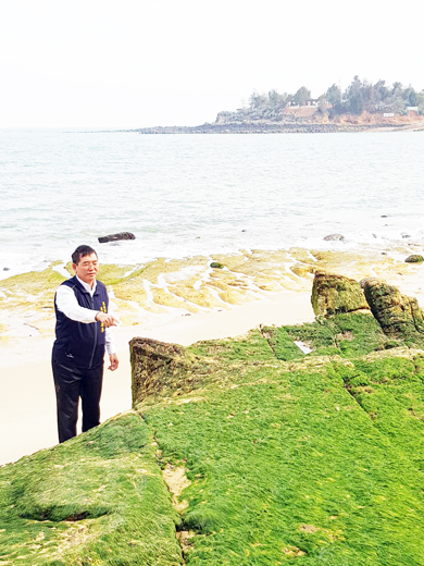 烈嶼鄉南山頭的海岸,最近一大片綠油油的「綠石槽」海岸景觀美景,吸引不少民眾前往欣賞。烈嶼鄉代會主席方駿洋也到場捕捉春季限定的自然美照。方駿洋歡迎大家走訪烈嶼鄉南山頭海岸,欣賞柱狀玄武岩、綠石槽等美麗景色。 烈嶼鄉代會主席方駿洋指出,每年3、4月,烈嶼鄉南山頭的海岸,會出現以石蓴、滸苔等為主的綠色藻類布滿石槽,讓岩礁看起來就像連綿不盡的「綠色地毯」,形成令人讚嘆的「綠石槽」海岸景觀,美不勝收。方駿洋說,一大片坐落在清澈蔚藍海邊的礁石,披上綠油油的春日新衣,遠眺整個海岸好像被覆上一層天然的綠色地毯,形成令人驚嘆的「綠石槽」奇景,襯托藍海美景,讓人忍不住多拍幾張春季限定的自然美照。 方駿洋指出,位於青岐的南山頭海岸,除了有獨特的玄武岩地質景觀,每年的春天,以石蓴、滸苔等為主的綠色藻類,布滿石槽和海蝕溝,呈現了多層次的美感,放眼望去,彷彿連綿不盡的綠色地毯,縱向的溝槽,紋理分明的岩脊,讓廣闊海景,更顯萌感,相當值得一看小金門的綠石槽之美。 方駿洋說,拍攝綠石槽的最佳時機是在每年三到四月,潮汐最低前後,石槽才會露出,是最佳的拍攝時間。 方駿洋歡迎各地好朋友到烈嶼欣賞豐富的自然生態景觀和美麗海岸風光,也提醒大家要到南山頭欣賞綠石槽,能在沙灘上觀賞、取景,不要去踩踏綠石槽,以免影響到藻類的生長、也可避免滑倒。