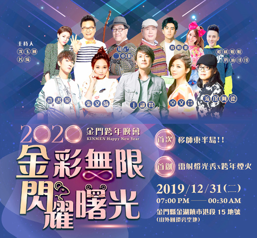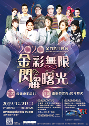 揮別2019迎向2020,金門跨年晚會首度移師東半島金湖鎮舉辦,以「金彩無限閃耀曙光」(見活動海報)為主題,今日晚間7點在金湖鎮市港段15地號(山外圓環旁空地)倒數跨年,熱力開唱。邀請8組金強獨家陣容,有王識賢、卓文萱、流氓阿德、張文綺、許書豪、廖柏雅、知己二重唱及小朋友最喜歡的奶油哥哥、櫻桃姐姐連續6小時接力開唱,還有綜藝鬼才沈玉琳及名模若綺共同搭檔主持。精采可期,嗨翻金門跨年夜! 此外,首創雷射燈光秀與煙火將有180秒絢麗登場,一起倒數迎接新年。 金門縣文化局表示,除了超強藝人卡司演出之外,由徵選出3組金門在地優質表演團隊,有KDC金門流行舞蹈團、金寧中小學寧鼓隊及國立金門大學街舞研究社共襄盛舉,多元節目將點綴晚會中。現場周邊有28攤金讚的創意市集,豐富在地小吃及文創商品下午3點正式開張。 晚會中的周邊活動,更是超多好康,晚間6點有好康1-按讚送充氣加油棒,只要上「藝起金門」粉絲專頁按讚就可領取一對;好康2-2020愛的祝福語,民眾填寫新年祝福語黏貼上專屬愛心背板即可獲得充氣加油棒1對;好康3-摸彩活動,只要到服務台排隊就可領取摸彩券1張,活動中將送出電動自行車、43吋液晶電視、任天堂Switch等豐富大獎。另外,為推廣金門在地優質表演團隊,現場將開放民眾投票,人氣獎由你決定,晚間6點於服務台發放人氣投票貼紙,票選出今晚演出的在地表演團隊前3名人氣獎,並頒發獎金及獎狀。 晚會也將進行交通管制,舞台後方道路為煙火管制區將禁止車輛行人通行,為使鄉親停車便利,山外車站後方停車場活動時間也開放免費停車,另活動附近皆有停車處,再步行約5分鐘即可到活動會場。晚會結束後並安排回程往金城、金沙車站及烈嶼的免費接駁車,預計於1月1日00:40發車,烈嶼接駁船會配合接駁車到達時間開船,敬請鄉親使用搭乘。相關活動可上金門縣文化局官網(http://cabkc.kinmen.gov.tw/)及藝起金門臉書(https://www.facebook.com/AAE28)查詢,一起嗨翻2020金門跨年晚會。