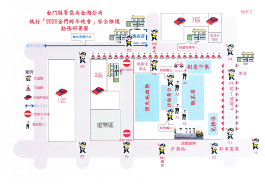 2020金門跨年晚會活動明(31)日晚間將在金門縣金湖鎮新市圓環旁空地(市港段15地號)登場,金門縣警察局金湖分局為配合該活動,期間將實施交通疏導管制工作,以確保民眾安全及道路行車順暢。 金湖分局分局長黃維章呼籲前往參與跨年晚會的民眾及行經該路段駕駛人,配合員警指揮,一起開心跨年,平安回家。 金湖分局指出,2020金門跨年晚會活動將於12月31日晚間七時起至翌日凌晨1時止在金門縣金湖鎮新市圓環旁空地(市港段15地號)舉辦,相關交通管制措施如下:一、交通管制時間為12月31日下午五時起至活動結束止(預計至凌晨一時),管制區域為活動現場周邊道路並視各路段、區域交通狀況採彈性開放通行,確保交通順暢。二、道路管制部分(如參考圖示):(一)主舞臺後方空地(含道路)為煙火施放區,除該路段管制外,其餘道路均開放雙向通車,另道路沿線禁止路邊停車,車輛均停放於規劃之汽、機車停車區,相關停車區資訊如下:1、機車:沿赤東路規劃單邊為機車停車區。2、汽車:市港路重劃區空地規劃三處汽車停車區。3、除上述規劃之停車區域外,另有金湖菜市場後方停車場(金湖分局已協調廠商調整免費時段到109年1月1日上午八時,屆時請駕駛人放慢行駛)及紅龍餐廳前空地停車場可供停放。(二)行人穿越馬路請走行人穿越道。(三)救護車、消防車、執行公務車輛開放通行。 金湖分局表示,相關之交通疏導管制措施可於金門縣警察局(金湖分局)網頁及臉書上查詢,請參加跨年活動民眾事先上網查看,汽、機車駕駛人請聽從警察人員之引導行駛,以維持交通之順暢。