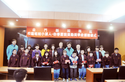 金門縣稅務局108年「校園租稅小達人-你學習我獎勵」獎學金頒贈儀式,昨日上午在金門縣政府新聞發佈室舉行,共頒發國中組1,000元獎學金20名,國小組600元獎學金20名,由副縣長黃怡凱頒贈,並邀請教育處副處長陳家輝、多位校長、師生等共同參與。 副縣長黃怡凱致詞時表示,稅務局今年為落實校園租稅教育,強化宣導的深度與廣度,採用與以往不同的各校各班的宣導方式,首度推出由學生自行線上學習,觀看宣導影片,作答測驗題的宣導活動,讓更多金門學子培養誠實納稅觀念,及認識我國租稅制度、雲端發票、納稅者權利保護法等,也感謝各校協助推廣,今年共有1,027人次學生參與,但統計結果答案錯誤及重複率偏高,僅26.77%的學生可參與抽獎,即278名學生可參加抽獎,共40名的獎學金,稅務局於108年12月20日已公開抽出,恭喜得獎的同學。 副縣長黃怡凱並說明納稅是國民應盡的義務,合法節稅更是納稅者的權利,每人一輩子都離不開繳稅,一般大眾覺得稅法艱澀難懂,但稅務局以觀看動畫影片方式,寓教於樂,讓稅法更容易親近,了解稅法規定,不讓自己節稅權益睡著了。他也鼓勵更多同學繼續參加,來增進租稅觀念和拿獎金。 金門縣稅務局局長翁自保表示,校園租稅小達人活動將繼續辦理,鼓勵學生了解各項租稅法令,建構基礎租稅概念,潛移默化下,進而達到租稅教育向下扎根之目的。