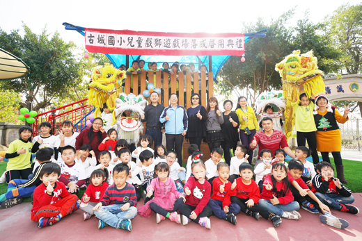 設立在古城國小的兒童戲獅遊戲場啟用了!古城國小日前舉行落成啟用典禮,在學校獅鼓陣熱鬧精彩演出下揭開典禮序幕。 典禮由校長楊成業主持,全校師生、家長會副會長沈毓琪及多位委員與學生家長共約三百人參加,共同見證最近剛完成的兼具特色、創意、安全、優質等優點的兒童戲獅遊戲場落成啟用,將陪伴古城的孩子們度過歡樂的童年與創造許許多多快樂與溫馨的經驗。 古城國小原有舊的兒童遊戲場因為使用已經十五年了,在教育部同意補助下,規劃設計新的遊戲場,工程於去年十二月初完成驗收,新的兒童遊戲場於焉誕生。該座新的兒童遊戲場取名戲獅遊戲場,其設計係結合該校所在社區的環境、人文及該校的特色課程獅鼓陣等特色而設計的,擷取該校校名及金門城城門的概念設計了一座「古城遊戲屋」,搭配學校發展特色獅鼓陣及舞龍舞獅,因此設計一座了龍貓造型地景撐著巫婆芋遮陽傘,敲著「太極大鼓爬架」而戲獅。另採取風獅的意念,設計了「風獅爺地景」與「風獅爺爬網」,再加上「炮竹雲梯」,串聯各部分設計整體結合成為「古城戲獅遊戲場」。 這是一座專為古城國小量身設計訂做全國獨一無二的兒童戲獅遊戲場。楊校長感謝教育部的專案補助經費及縣府教育處的協助爭取經費,以及該校教導處、總務處及幼兒園等有關行政同仁的配合爭取改善計畫及辛勞。他也期勉學生要抱持感恩的情懷及珍惜的態度並遵守遊戲場使用說明及規範來使用,才能玩得又快樂又安全。