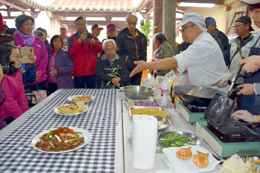 為了介紹金門拭餅文化及其相關文化內涵,金門縣文化局於108年間在五鄉鎮舉辦系列推廣活動,委託金門縣采風文化發展協會執行,日前於蔡厝蔡氏家廟舉辦最終場。活動主打「創意」、「傳統」兩個部分,不單是品嚐美味,把文化傳承下來,更與時代並進,在傳統的拭餅裡添加新的元素。 由金門縣采風文化發展協會負責規劃籌備,繼之前於五鄉鎮進行分場活動推廣,此次在蔡復一老家蔡厝舉辦大型主場的拭餅文化推廣活動。文化局局長許正芳、副局長黃雅芬、金沙鎮鎮長吳有家、人事處處長蔡流冰、教育處社教科長許能麗、國教科科長葉麗珠等人與會,和社區居民共襄盛舉。 活動由縣府人事處處長蔡流冰、黃振良老師、李木隆老師率先展開拭餅論壇,三人先後介紹蔡厝冬至的祭祀活動,以及蔡厝的地理與人文,和蔡復一的故事。祭祖,在金門是大事,一般多只在清明時吃拭餅。金門縣文化局力推金門在地的非物質文化遺產,拭餅也位列其中,系列推廣活動就是要讓更多人認識這在地人的共同記憶。拭餅據傳是蔡復一的夫人研發的,因此「拭餅文化在蔡厝」活動特意在蔡復一的故鄉蔡厝舉辦。配合拭餅文化推廣活動,作為活動的會場的蔡厝家廟,蔡氏族人在敬告祖先後,將拭餅菜擺上桌子,請祖先也一同享用。 活動請金門農工黃俊杰、薛惠萍兩位老師指導創意拭餅料理,由老師和學生一起製作了前菜、主菜、甜點三樣創意料理,由采風文化發展協會理事長葉鈞培介紹菜色。前菜用豬舌頭、牛肚,及在地食材,用日本料理的手捲方式呈現;用拭餅皮取代海苔,將彩椒、小黃瓜、紅蘿蔔、蘋果切好備用,用鹽巴、胡椒、奶油調味,將撒了辛香料的筊白筍、茄子加以烤過,以及生菜沙拉和肉,這些豐富的食材全部包在手卷裡。主菜,則是將三杯雞也包進拭餅裡,主廚表示創意就是想吃什麼就加什麼;選吃起來有咬勁的帶骨雞肉製作,在包進拭餅前把骨頭去掉即可。甜點,則是將拭餅皮炸過,然後與鬆餅、鮮奶油、水果放在一起,就成了大人、小孩都喜歡的美食。 創意拭餅皮則是在麵漿裡加了五香粉、咖哩粉、火龍果。五香粉味的餅皮和豬肉、牛肉很對味;咖哩粉味的餅皮,則用來和三杯雞搭配;火龍果味的餅皮就拿來搭配甜點。 製作拭餅皮,得將和好的麵團在高溫的鐵板上抹上薄薄的一層,靜置個幾秒後揭起,翻面再熱一下,就可拿到一旁待用。不少參加活動的民眾,對於這難得的抓拭餅麵糰比賽及餅皮製作體驗無不躍躍欲試,有民眾表示握在手中的麵團越小越難「擦」;製作過程中也可見有製作過餅皮的人的熟練及專業程度了,一氣呵成般的一抹一揭,就完成了好幾張形狀漂亮又厚薄適中的餅皮。