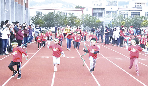 金湖國小附設幼兒園辦理耶誕節親子活動,模擬縣運會,首先進行全園12個班運動員創意進場及表演,幼生裝扮可愛跟著節奏搖擺舞出大會操和大會舞,親子分年級以趣味競賽同樂。壓軸登場的迷你大隊接力賽,為活動帶來另一波高潮,孩童無不奮力向前衝,場邊家長則盡情吶喊加油,好不熱鬧。親師生在暖呼呼的氣氛中,共度不一樣的耶誕節。 金湖幼兒園延續去年廣受好評的小小運動會,將運動會及節慶活動結合,於20日舉辦親子慶祝耶誕運動會,湖幼12個班級幼生、家長齊聚一堂,柏村幼兒園師生也到場參與並參加進場。活動模擬縣運會,首先進行運動員進場,幼生以班級為單位跟隨老師指引進場,自運動場跑道起點沿路步行至司令台前表演,熱鬧、活潑、可愛,滿滿活力感染與會來賓和家長。師生準備特色加油口號,加上精心裝扮,展現各班之獨特性,加上不時有童言童語,逗得家長樂開懷。 而幼兒園各班在完成進場後大會操、大會舞中,所有的小朋友莫不卯足全力跟著節奏韻律扭動小小可愛的身軀。接著並分年段進行親子趣味競賽,配合即將到來的耶誕節特別安排「齊心協力運雪球」、聖誕老人送禮物」(大班);「幸福溜溜球」、「愛的抱抱」(中班);「當我們圈在一起」、「毛巾運球」(小班)等,小朋友無不使出渾身解數,幫班級爭取最高榮譽,與會家長和來賓也不時給予小朋友熱情的掌聲和鼓勵,場面相當熱鬧。 而壓軸登場的迷你接力賽,為這場幼兒運動會和親子活動再掀一波高潮。小小運動員個個奮力向前跑,一棒接一棒齊心為班級爭取榮譽,場內的小朋友跑得賣力,場邊家長也沒得閒,一邊吶喊一邊用相機拍照捕捉孩子的每一個瞬間,也為親子留下美好的時光。 金湖國小表示,不同年齡層每天進行適量及適合的運動,不但能促進小朋友的身心發展,也有助於老師的課程發展及小朋友的學習成效。金湖幼兒園落實每天30分鐘以上大肌肉運動。今年的耶誕親子活動,也採用運動會的方式呈現,參考縣運會模式,讓師生在活動中展現班級特色和活力,也透過趣味競賽、大隊接力賽,讓小小運動員培養親子情誼,運動家精神及團隊精神和榮譽感。