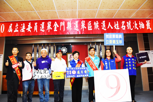 金門立委選情激烈,10位候選人號次抽籤結果揭曉,1號洪志恒、2號許丕肯、3號陳滄江、4號林志錦、5號洪正、6號盧月香、7號陳福海、8號洪和成、9號陳玉珍、10號程耀德。 第10屆金門縣立委選舉昨日上午10時起在縣府多媒體簡報室舉行選舉號次抽籤,依登記序先後有台灣基進黨洪正、金門高粱黨主席洪志恒、無黨籍洪和成、國民黨競選連任的陳玉珍、中華統一促進黨金門縣黨部主委程耀德、中國生產黨主席盧月香、無黨籍的林志錦、中華新住民黨中央評議委員許丕肯,以及無黨籍的前縣議員陳滄江和前縣長陳福海10人登記角逐,昨日號次抽籤由金門縣選委會依候選人登記順序進行抽籤。10位選將除了洪正和陳福海由主持人代抽,另8人均親自到場,近年來在金門大小選舉幾乎無役不與的洪志恒,昨日不改「歌王」本色,在自己改編歌曲「我的未來不是夢」的助威下邊唱邊抽,手氣極旺的他也一舉抽中1號籤王。 除了透過歌聲傳達個人「不會忘記對金門的承諾」,洪志恒還唱出「我的心跟著金門在動」真性情的一面,抽中籤王後,他則用「三陳都應退出政壇,唯一支持洪志恒」的吶喊和歡呼,展現自己進軍國會強大的信心。 代表國民黨尋求連任的陳玉珍抽到9號,她除了高效率的立即端出大型號次籤,也喊出「玉珍當選、金酒長長99」的吉祥話。抽中10號的中華統一促進黨金門縣黨部主委程耀德,除了強調要做「金門的勝海舟」,也高喊「台灣安全、金門發財、10全10美」。 期待金門鄉親給機會的中國生產黨主席盧月香抽到6號,陪同她到場抽籤的支持者高興的大喊「66大順」,無黨籍的林志錦則抽中4號,林志錦說,他是素人參政,金門的市場和格局被一些政治人物愈做愈小,是他決定參選的主因,「4在必得」,他有信心透過科技立委角色的扮演,為金門創造更可觀的觀光財。 代表中華新住民黨參選的許丕肯抽到2號,許丕肯說,他是抱著辦喜事的心情參選,也期待藉著個人在選戰的發聲,催生離島金門法,讓金門成為世界的金門,國際的亮點。 從少年拚到白頭的「江哥」昨天抽到3號,他說,20年了,這是他第四次參選立委,這一生他都在為這塊土地打拚,一直未能如願向國會叩關,他也常深自檢討,是不是做得不夠好,再拚一次,他相信鄉親會給長期為民主打拚的江哥一個機會。 昨天未到場抽籤的前縣長陳福海,在最後一刻得知大家把7號籤留給他,他也難掩興奮的透過臉書留言:「他抽到一個全球最愛的數字Lucky7!」。