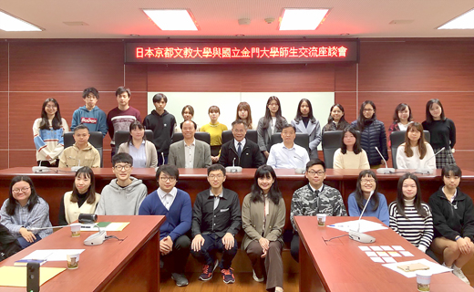 京都文教大學綜合社會學部日前由教授潘宏立率領訪問團至金門進行海外實習,一行十人拜訪國立金門大學人文社會學院,與金大三十位師生進行座談,希望讓該校學生藉由本次台、金、廈、泉等地的海外實習深入了解兩岸華人世界的多樣性。 主持「日本京都文教大學與金門大學師生交流座談會」的金大人文社會學院院長陳益源,為了歡迎第一次來到金門的這批日本大學生,特地邀請該院國際系助理教授劉冠,和選修日語課程的二十幾位金大學生,以及對與日本交流有興趣的華文系、都景系、觀光系學生共同參與座談。 據京都文教大學訪問團帶隊老師潘宏立教授、助教藤本富惠表示,位於宇治市的京都文教大學屬於京都文教學園,已有一百十五年的歷史。該校注重從「心理」、「文化」、「社會」三個面向研究人類,在「臨床心理學」、「文化人類學」方面的教學、研究都在日本的大學裡具有鮮明特色,擁有最強的師資力量。 來訪的日本學生白井彩奈,代表京都文教大學綜合社會學部綜合社會學科向大家介紹該校。學校所在的宇治市,位於京都南部,是日本最高級茶宇治茶的產地,有世界文化遺產的平等院鳳凰堂等,又是日本古代長篇小說《源氏物語》中的〈宇治十帖〉的舞臺。她說她們學校特別重視實踐性的教學,綜合社會學部每年都有多項國內外的實習讓學生到各地進行實地調查實踐,這是學部第一次安排學生到金門來,她們希望能夠藉此了解金門的現代與時尚、傳統與民俗,以及本地同齡學生的學習生活。 在觀看金門大學日文版的學校簡介之後,來訪的京都文教大學學生代表兩人一組,依序介紹「日本的春夏秋冬」、「日本的動漫歷史」、「日本的流行文化」、「日本的關西方言」,得到現場金大學生的許多迴響,也向他們分享金門的閩南語、物價、飲茶習慣和汽車使用情況等。交流座談結束之後,金大的同學們領著京都文教大學訪問團的日本學生參觀了金大校園,並以日語繼續交談,進行各種生活話題的輕鬆交流。 祖籍福建、旅居日本近卅年的教授潘宏立表示自己是閩南人,這次能帶日本學生到閩南文化重鎮金門來進行海外教學,覺得格外親切。他說:「多年來我們學部的海外實習曾到海外許多國家舉行,非洲、美洲、歐洲都曾去過。今年的海外實習分為東南亞(泰國、馬來西亞)及中華世界(兩岸)兩部分。中華世界的實習是第一次舉辦,原來預定在兩岸三地舉行,後來香港因故取消,集中在臺北、金門及廈門、泉州等地舉行。目的是為了讓學生深入瞭解中華世界的多樣性,畢竟兩岸三地的社會具有中華社會文化的共通性,又有各自鮮明的特點。希望通過實地調查與交流,達成以上目標。」