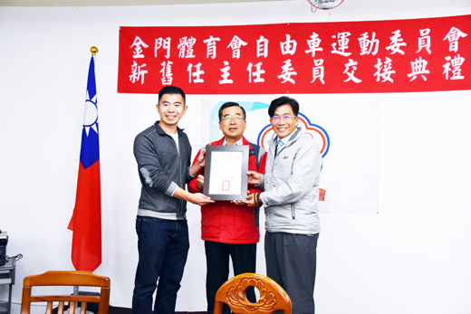 金門體育會自由車運動委員會新舊任主任委員交接昨日假救國團舉行,新任主委陳孝瑜自前任主委黃聿標手中接棒,帶領委員會邁向下一個里程。 縣府祕書長陳朝金、社會處長董燊、行政處長陳祥麟、風火輪協會理事長吳媽能、單車安全協會理事長江支森等人與會,期勉新主委在任內能讓自由車運動在金門縣更加地蓬勃發展。 陳朝金指出,單車運動在歷任主任委員及愛好者共同推動下,從早期的交通工具單一角色成為休閒運動競技的重要項目,透過委員會舉辦活動,吸引許多外地朋友到金門來,自由車運動是正向的活動,值得我們大力推動。 新任主委陳孝瑜感謝體育會讓年輕人能有機會表現,組成一個在體育會中算是年輕的團隊,用新的方式讓金門的體育呈現新的樣貌,讓金門更多人參加運動性質的活動。