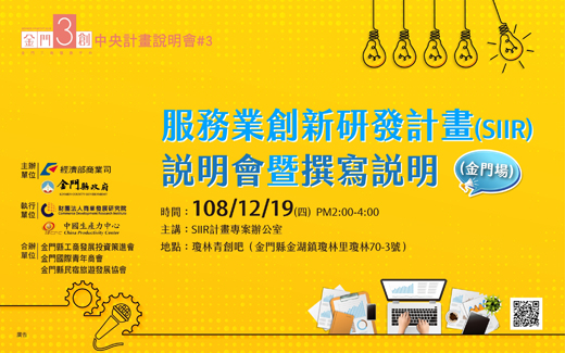 金門縣政府為協助金門在地業者申請「服務業創新研發計畫(Service Industry Innovation Research)」,本月19日下午二時起將在瓊林青創吧(金門縣金湖鎮瓊林里瓊林70-3號)與經濟部商業司共同辦理「服務業創新研發計畫(SIIR)說明會暨撰寫說明(金門場)」,說明會報名網址:https://tinyurl.com/sz4lq5g,歡迎在地業者踴躍報名參加。 縣府建設處表示,本場說明會由金門三創服務平台與金門縣工商發展投資策進會、金門國際青年商會、金門縣民宿旅遊發展協會、金門縣青年創業協會共同合作,期藉由在地產業公協會力量一同推廣產業創新計畫,鼓勵更多在地業者自主投入「智慧商務」、「品牌創意」、「數位生活」、「休閒體驗」與應用「新服務商品」、「新經營模式」及「新商業應用技術」規劃具體可行的研發計畫。 經濟部商業司SIIR計畫進一步指出,本次說明會將以「計畫說明」和「申請速成技巧」為主,內容分別為主題性引導創新關鍵、激盪企業創新能量和步驟式教學申請資格、應備資料、審查流程、會計科目編列原則及查核要點等,歡迎在地產業先進共同參與投入。 經濟部也說明,這項全台唯一針對服務業之政府補助計畫已開始申請,自即日起至109年1月15日下午5點30分止,依計畫網站時間認定,逾期不予受理。 另外,三創服務平台14日辦理跨境電商系列課程│高階班第二堂,邀請到TeSA台灣電子商務暨創業聯誼會共同創辦人陳宏欣分享「以淘寶實操及各種營運、廣告宣傳為主的中國大陸電商經營實戰」,以操作掏寶賣店(天貓、1688、全球購)的經驗來告訴學員如何設立公司、運輸報關、稅制,並告訴學員大陸稅制的嚴重性與重要性,和淘寶廣告模式,學員收穫良多。12月21日並將以淘寶達人直播、映客及各直播模式和短視頻(抖音、快手等平台銷售模式)來教導學員如何快速實作使用! 更多詳情請上官方網站:金門三創服務平台(網址:http://youthhub.kinmen.gov.tw/)/臉書搜尋:金門三創服務平台,或加入LINE好友:@kod4743g。