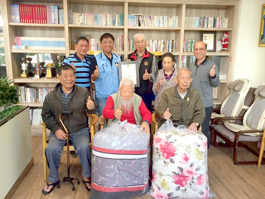 金門地區耆老李錫榮先生日前偕同夫人黃娟治女士到大同之家關懷慰問,捐贈一批棉被給大同之家的長輩,為感謝其夫婦的愛心善舉,主任楊志斌特別邀請李錫榮夫婦與長輩合影,並致贈感謝狀。 為讓長輩感受社會大眾的溫暖心意,大同之家於接到捐贈之時,已將被子一一親手送到阿公阿嬤的手中,長輩們備感窩心,也很感恩善心人士的愛心,主任楊志斌表示 「心中有愛,推己及人,化小愛為大愛」,寒冬未到,謝謝李錫榮賢伉儷把「家裡」的阿公阿嬤記在心內,並用具體的行動來表達對長輩們的疼惜關愛,為「家裡」注入一股暖流,準備迎接寒冬的到來。