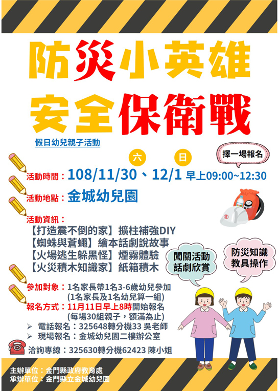 為推動防災素養向下扎根,防災教育從「幼」學起,金門縣政府教育處將於11月30日(星期六)、12月1日(星期日)上午9時至12時30分在金城幼兒園舉辦兩場「防災小英雄安全保衛戰」幼兒親子活動。11月11日開始報名,報名專線325648轉33吳老師,或請親至金城幼兒園二樓辦公室報名,每場限30組,額滿為止。 「防災小英雄安全保衛戰」幼兒親子活動,採一位家長帶一位三至六歲幼兒即可組隊擇一場次參加。活動中規劃地震、火災、人為災害主題課程,還融入影片教學、教具操作、分組闖關、話劇欣賞,讓親子在感官及互動體驗中學習防災知識。 此次活動一共安排六種教學單元,有「防災小學堂」災害入門課程,從影片情境中瞭解災害是什麼,透過教具說明災害發生的應變方式;還有五種分組體驗課程,分別有「火災積木知識家」紙箱積木遊戲、「火場逃生躲避黑怪」煙霧體驗、「打造震不倒的家」房屋補強DIY、「地震來了躲哪裡」找尋地震避難位置、「避難包了沒」整備防災用品;活動尾聲還有「蜘蛛與蒼蠅」話劇說故事,引導孩子對災害的認識並建立安全意識。全程參與集滿闖關貼紙即可兌換「防災小英雄火災篇」一本提供親子共同閱讀,培養防災素養。 活動自11月11日開始報名至額滿為止(每場名額30組親子),家長可撥打報名專線325648轉分機33吳老師,或直接到金城幼兒園二樓現場報名,報名後,活動前一週將公告錄取名單於縣府教育處網站,歡迎親子踴躍參與,共同學習正確的防災觀念。