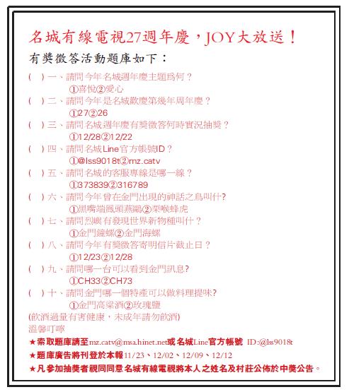歡慶27年周年慶!名城有線電視有獎徵答活動開跑囉!自即日起至12月23日截止收件,並將於12月28日上午九時舉行實況抽獎。名城表示,今年以「JOY大放送」為主題,獎項豐富有 iPhone 11Max 墨綠256G等大獎,期盼獎落你家,喜悅盈滿門! 名城董事長許雪芳表示,名城已滿第27個年頭,一路走來用心深耕金門,秉持著「服務鄉親」的精神,就是要跟您共享生日喜悅!感恩金門鄉親對名城週年慶熱情支持,今年27週年慶主題「JOY」就是要你每天充滿喜悅的心情迎接當下生活點滴。 許雪芳說,名城每年周年慶活動彩品來自全台各頻道商獨特限量版禮品,以及金門地區各機關行號、特產業者大力支持,每一份禮品、每一張明信片都是共同護持名城周年慶圓滿,更傳遞滿滿的愛與您分享喜悅;今年預計超過一千二百個以上獎項,歡迎鄉親跟我們一起JOY,今年週年慶各項活動內容如后: ◆「JOY」活動一:凡居住金門地區尚未安裝有線電視的住戶,自即日起至109年1月31日止申請裝機並預繳十二個月以上收視費(年繳$6,750元)可享有免裝機費(原價$1,500元)+贈送一個月收視費之優惠(原價$580元)。 ◆「JOY」活動二:舊客戶回娘家活動,舊客戶自即日起至109年1月31日止申請復機並預繳6個月以上收視費(半年繳$3,450元),即可享有免復機費優惠(收視費若採年繳者適用贈送1個月優惠方案)。 ◆「JOY」活動三:原用戶收視費採用年繳即贈送1個月收視費(年繳$6,750元)。 ◆「JOY」活動四:開放室外移機費之優惠活動。 至於今年週年慶有關有獎徵答活動規則如下: 一、收件日期即日起至12月23日止截止收件(以郵戳為憑)。 二、題目採10題選擇題,答案應以阿拉伯數字表示,題目全數答對者才可參加抽獎;並使用中華郵政標準明信片,明信片請勿自行變更尺吋及後製加邊框、邊緣著色(將視同作廢),題庫可重複影印,在填妥答案後剪貼於明信片背後,逕寄至名城有線電視,地址為金門縣金寧鄉仁愛新村43號活動組收,請於明信片上註明,寄件人姓名、住址、E-mail、聯絡電話,以便於得獎後連繫。 三、若因答案有誤及上述資料填寫不明無法取得連繫或資料填寫不實者將視同放棄中獎權利。 四、參加有獎徵答的對象僅適用名城有線電視家庭收視戶(包含其同一戶籍之眷屬)。 五、每人限得獎一次,以第一次抽到的獎項為主,獎項不得轉讓、折換現金或其它商品;本活動獎品之規格及外觀以實物為準,如遇不可抗力之因素,主辦單位保有隨時修改活動辦法及獎項或終止本活動或變更同等價值商品之權利。 六、本活動規則及相關注意事項載明如上,參加者於參加本活動之同時,即同意接受本活動之相關規範。 七、得獎人必須於109年1月5日前帶著身分證或戶口名簿及印章等至名城有線電視領取,因配合扣繳憑單申報作業時間,請中獎者務必於期限內完成領獎,逾時將取消受領資格。 名城表示,依中華民國稅法規定,得獎獎項價值超過新台幣1,000元者,應開立「各類所得扣繳暨免扣繳憑單」予得獎人,若獎項價值總額超過NTD$20,010元,將代扣10%稅額(非中華民國境內居住之個人依法扣繳20%之稅金)。 得獎者須依所得稅法相關規定,申報綜合所得稅。代領者必須攜帶個人身分證、印章及得獎人身分證或戶口名簿及印章。 名城表示,有獎徵答活動預定於12月28日上午9時至下午5時以現場實況轉播的方式公開抽獎,抽獎結束後中獎名單將公佈於金門日報及名城LINE@官方帳號,並於名城綜合台節目重播。諮詢電話為(082)373839、312345或mail至mz.catv@msa.hinet.net、名城Line官方帳號ID:@lss9018t索取題庫。 名城指出,因應個資法,其活動所收集之客戶資料僅作為:1、抽獎憑證2、領獎證明之用,領獎結束後二週內,所有明信片統一壓縮銷毀,不會留存。另,凡參加「名城有線電視108年JOY有獎徵答」活動之抽獎者,若中獎者視為同意將本人之姓名、村莊公佈於名城綜合台、名城Line官方帳號與金門日報中獎公告,以利獲知中獎訊息。 名城表示,相關獎項包括有:iPhone11Max墨綠256G一台、金酒55吋液晶電視一台、議會43吋液晶電視一台、金沙鎮公所腳踏車一台、金寧鄉公所腳踏車一台、金城鎮民代表會電風扇一台、工策會紀念酒十份、聖祖貢糖三十份、上古厝麵線禮盒三十份、喬安牧場禮盒三十份、金湖飯店住宿券兩張、湖光西餐廳自助餐券組五組、21Bar英式下午茶兌換券組三組、金安航運小三通船票組十組、金廈海運小三通來回船票十組、風獅爺購物中心杯盤組十組、良金牧場禮盒十份、太武之春調理機十組、星創娛樂提鍋十五份、稅務局輕旅包十份、香蜂一條根禮盒五份、畜試所團圓鍋四份、金瑞成竹葉貢糖二十五份、金合利鋼刀二十五份、天之桂貢糖二十五份、王大夫一條根二十五份、金翔租車翟家酸白菜二十份、古多利咖啡禮盒二十份、老農莊牛肉乾二十份、美髮係禮品十組、洪師父牛肉乾禮盒三十份、國代建設有限公司炒鍋二十五份、陳金福號貢糖禮盒十五份、浯洲根牙膏組十組、民航站彩品六份、新敬業機車行十份、諾蒂亞國際床業禮品十份、碧山咖啡集興小舖咖啡組五份、瑞豐水電材料行免治馬桶座二份、遠東航空單程機票四份、華信航空單程機票四份、台電金門區營業處蒸火鍋兩份、金門陶瓷廠花瓶組三份、金門紅十字會保鮮盒組兩份、民進黨金門縣黨部小米手環三份、青商會長洪嘉偉野宴餐券十份、大河工作室家電品十份;喜悅獎:金酒組