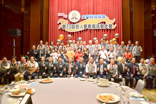 為傳達用心經營,以人為本的商道精神,金門縣商業會於5日晚間在金湖飯店舉行108年「第73屆商人節表揚大會」表揚地區12家優良商號,金門縣縣長楊鎮浯等親臨會場致詞,並與全體受獎人拍照留念,大會由金門縣商業會理事長李有忠主持。 本年度受獎商號包括:維興商店、名記食品企業有限公司、慶利、兆豐國際商業銀行股份有限公司金門分公司、國代建設有限公司、合興餅家、顏存仁藥房、鑫大成股份有限公司(IN99精品旅館)、金明生通運有限公司、莒光計程車客運行、金門皇家酒廠股份有限公司、敬業機車行等12家。獲得表揚的優良商號不僅有大規模公司,也有在地小商家,其共通點就是用心經營,秉持服務熱忱,展現專業技能且以實際行動做出具體貢獻,充分發揮商道精神。 縣長楊鎮浯致詞時首先表達感謝之意,金門這幾年的發展,就是各位商業界前輩的打拚,才有今天的金門。楊鎮浯說,縣府願意全力配合商業界,讓地區的商業越來越發展活絡,只要是縣府做得到的,都願意協助。 楊鎮浯表示,地區商業發展,才是地區的根本,他上任後有感於金門產業面比較單薄,一直思考、希望幫金門創造一些資助型的產業,因此積極推動跨境電商物流等,希望讓金門產業結構更多元豐富,同時也致力於讓地區傳統中小型產業有生存空間。 第25屆理事長李有忠表示,定竭盡所能,全心全力繼續創造金門縣商業會的光榮歷史,秉持商業會章程所訂任務,謀求會員福祉,促進商業發展。同時籲請會員代表齊力投入會務興革,並踴躍參與該會各項活動,促進金門地區經濟、傳統產業發展及商業繁榮,為百年商會傳承共同努力。 李有忠表示,商業對國家的繁榮、經濟的發展、國貿的開拓扮演極重要角色,此次商人節除了感謝各行各業在崗位上持續努力不斷付出及貢獻,也呼籲地區商家應推展商序、發揚商信,共同維護商德,除了用心經營,更要秉持「取之於社會,用之於社會」,回饋社會,共同創造友善環境、繁榮城市、行銷金門。 金門縣商業會前身為金門分商會,籌設於遜清宣統1年(即民國前3年、西元1909年),至今已有百餘年歷史。民國12年時任會長的傅錫琪先生以1100銀元購得四王爺宮周邊土地籌建金門縣商業會,並期四王爺神佑地區商業興盛,會址抗日期間為日寇占用,勝利後政府借用,至57年會址歸還。在第11屆全體理監事及會員響應下,由當任理事長汪載棣先生號召發起重建,歷屆每位理事長在任內無不竭盡全力健全組織,發展會務。 商人節定於每年11月1日,為紀念「中華民國商會全國聯合會」(現已更名為「中華民國全國商業總會」)的誕生。民國35年11月1日,全國各省市商會、海外各地華僑商會約50個單位和400餘位代表共同集會於首都南京組織而成。大會並通過是日為「商人節」,藉以推行全國商運的法定最高機構。全國商業界也都熱烈遵循慶祝。