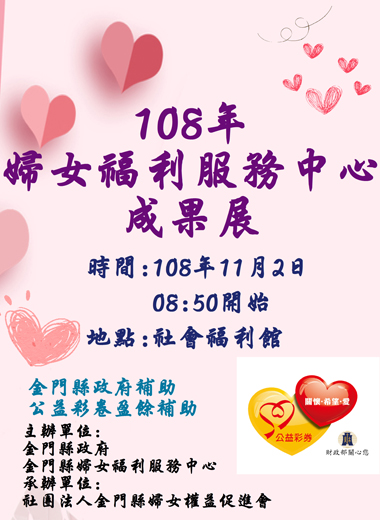 「108年度婦女福利服務中心成果展」訂於11月2日(星期六)假金門縣社會福利館舉辦,時間自上午8時50分起,現場以靜態作品及動態展演等方式呈現今年度婦女中心所辦理之各項活動成果,並規劃有宣導攤位以及邀請20組舞蹈及才藝團體到場演出,歡迎踴躍參與。 「108年度婦女福利服務中心成果展」,由金門縣政府、金門縣婦女福利服務中心主辦,委託社團法人金門縣婦女權益促進會承辦,公益彩卷盈餘補助。婦女中心在一年度的成果展中,規劃豐富多元的內容,除了靜態作品展示,並有年度成果影片供民眾欣賞。並且邀請機關及單位到場宣導,包括,社會處婦幼社工科、金門縣家庭教育中心、社團法人金門縣青少年暨兒童關懷協會、金門縣消防局、金門就業中心、金門縣衛生局、金門縣環境保護局、金門縣政府政風處、國稅局金門稽徵所、金門縣警察局、林務所植物園、金門家扶中心、金門縣選舉委員會、金門縣托育資源中心等單位。其中,國稅局宣導攤是採用性別平等有獎徵答及發票(8張或10張)兌換宣導品方式,發票月份請以9-10月份為主。 金門縣婦女福利服務中心表示,活動訂於11月2日登場,時間自上午8時50分開幕,並自9時30分起安排婦女舞蹈才藝展演,與會表演團體共計有20支隊伍,內容有各類舞蹈及傳統土風舞、有氧舞蹈等,以及現場成果影欣賞片、靜態成果作品展示、各單位宣導活動等,歡迎民眾踴躍到場觀賞並參與。