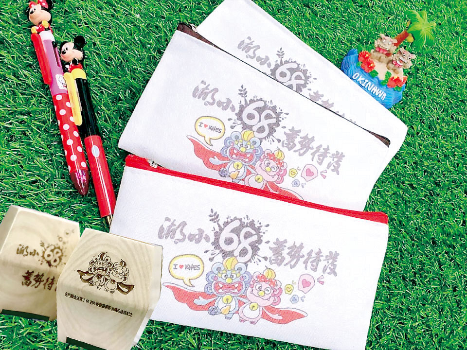 金湖國小68週年校慶適逢新校舍落成啟用,全校上下一條心為了「入厝」可是費盡心思做足準備。除了美輪美奐的硬體建設匠心獨運之外,湖小師生更藉此良機一展文創軟實力,包括「湖小68,蓄勢待發」標語、圖案LOGO、筆袋、木質筆筒、馬克杯、打卡背板及吉祥物等,並舉行文創發表會,彷彿一場盛大的文創嘉年華。 校方表示,「金湖國小68週年校慶暨新校舍落成啟用紀念」LOGO,由楊玉蘭、方玲琳老師設計,「湖小68,蓄勢待發」標語由陳正字主任發想、陳為庸先生題字。值此校慶時節,湖小吉祥公仔風獅爺「阿金」與「小湖」肩並肩敞開雙臂,蓄勢待發向前行,代表學生充滿健康的活力與好學的精神,並以「我愛湖小」來展現對學校的感恩;不規則噴墨土壤孕育著小樹苗,搭配代表新校舍的「悅揚」天燈冉冉上升,象徵全校師生在傳承68週年的優良校風及嶄新校舍中成長茁壯,朝向健康、勤學、感恩、創新、五育悅揚邁進。 植基前述創作理念,湖小楊玉蘭老師、方琳玲老師更將圖案及標語轉化為「阿金小湖帆布筆袋」,歷經數次改良,從形式、工法、圖案大小到拉鍊的顏色,不斷與校內同仁縝密討論、廣泛搜集意見,終而產出兼具美觀與實用的筆袋成品,校方預計贈予每位學童一人一份,不但能夠裝入文具,也很適合收納各式小物,陪伴學童度過健康快樂的求學成長階段。 金湖國小表示,「阿金與小湖馬克杯」在杯體的選擇上,為符合人體工學,把手改為較易握持的典雅款,杯子正面印有彩色版阿金小湖敞開雙臂圖樣,充滿熱情活力;杯子背面圖樣則走黑白線稿設計的內斂質感風格。方玲琳老師表示,廠商寄送的打樣與原始設計檔多有出入,為了幾毫米的位移、線條的粗細、色階的呈現等,幕後的溝通協調及確認便花了好幾週的時間,追求完美,近乎苛求。 此外,從新校舍圖書館—悅揚樓外觀酷似天燈造型所發想的木質筆筒,更是湖小文創設計團隊的心血結晶,由最初版本獨立切割再膠合的四隻腳座,透過團隊3D建模及打樣成品逐次修正,成為流線實用的時尚筆筒。筆筒製做完成後,正面及背面分別以雷射雕刻刻出「金湖國小68週年校慶暨新校舍落成啟用紀念」圖案,及「湖小68,蓄勢待發」標語,細看還能察覺有陰刻及陽刻的天燈冉冉升空,不僅文創品本身精雕細琢,甚至連外盒包裝的加工及黏貼貼紙,亦動用十餘人次盡力做到完美無瑕。 金湖國小校長陳為信表示,此次文創設計品的產出結合學童美術作品展覽,嶄新的校舍由師生富有溫度的作品共同妝點,校慶現場更設置精美的阿金小湖打卡背板,歡迎各界踴躍前往參觀。校方特別感謝金湖國小林嘉森會長帶領的家長會戮力支持校務發展和贊助全校師生紀念衫經費,及陳文顧理事長率領的校友會捐贈部分文創製作經費,此外呂瑞泰董事長引領勵學基金會長年來的大力協助學校,湖小走入第68個年頭,作育英才無數,社會上各工作崗位打拚的學長姐們時常回饋母校,造福莘莘學子。