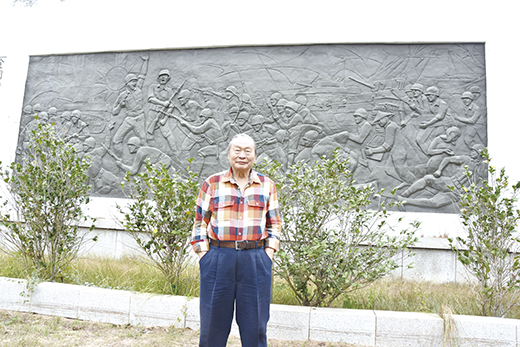 「真虧他們能將這麼大的作品搬來這裡。」看著矗立在環保公園一角的浮雕作品「金門精神堡壘」,原作者謝孝德如是的感嘆道。 畫家謝孝德是「金門精神堡壘」浮雕作品的原作者,民國五十五年,正服役的他奉上級的命令完成了這件長十六公尺、高七公尺的浮雕作品,呈現古寧頭戰役時軍民合作抗敵的景象,此行訪金是隨同桃園市文化局和桃園市在地畫家眾人一同來金寫生,特別到環保公園和古寧頭戰史館看看他當年的創作。 「金門精神堡壘」完成後原立在金城鎮東門圓環旁的公園內,八十八年移到環保公園現地,九十九年又仿作了一件立在和平紀念公園區。民國五十五年,時任高砲行政官的謝孝德奉金防部司令尹俊將軍之命創作。為能如實呈現戰役時的情形,上級請來參與戰役的老兵描述戰役時的裝備及服制配件。經反覆確認後方用瓷土塑造,經數月才完成初步的模型,再用白水泥塑成原件;創作期間數度往返台金之間,採買雕塑刀、石膏等工具及耗材,再費時七個月終於完成作品,立在金城鎮,作為象徵金門精神的作品。 退伍後迄今,期間曾數度返回金門,但未得見在原址的作品,謝孝德這回是抱著訪舊探親的心情而來,看到作品安然無恙的,卻又孤零零地矗立在環保公園的一角,心下不禁感慨,「這麼有意義的作品應該讓更多人注意到」。旁人提醒他在和平紀念公園有一復刻品,趕往探視後驚嘆當年將原作移到環保公園的人的細心,「當初是外模焊接後灌水泥,作品非常巨大沉重,是怎麼搬到這裡的呢?如在作品遷移時能在場見證,一定非常有意思。」 謝孝德隨後又造訪古寧頭戰史館,遠遠的看見作品,就將原作者的名字一一指明出來。金防部司令官宋心濂將軍在七十三年透過師大找謝孝德等台灣畫家到金門完成作品,「用最好的顏料、最好的畫布作畫,連畫框都是用很好的木頭製成」,謝孝德表示,戰役的情景是透過老兵描述後完成,紅赭色的崖壁和崖下一灣白沙灘,以及兩軍不同的服制都是考究過的。看著七十四年建館完成的古寧頭戰史館內陳列著許多文物,身為藝術家的他不免犯嘀咕,「畫作這麼大,這不都得站很近才能看了嗎?」 當年在畫作完成後,上級送他一瓷瓶裝高粱,到現在還珍藏著沒喝。「就開來喝了吧,放久了,味道可不一定保質。」旁人這麼勸著。酒可能變醋,不過他和金門因創作結緣的記憶,可是越陳越香,說來特別有味道。