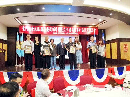 金門縣榮民服務處為慶祝輔導會成立65週年暨第41屆榮民節,於昨(31)日上午舉行紀念大會,由處長呂媽定主持,會中頒獎表揚模範榮民、績優榮欣志工、績優社區服務組長、優良廠商代表及新住民幸福家庭楷模;值得一提的是該處推薦代表金門參加全國性「榮民楷模」甄選金城區葉順豐先生,獲選輔導會年度榮民楷模,並赴台接受表揚,地區的全體榮民莫不與有榮焉。 昨日頒獎表揚名單包括,榮民楷模:鄭正志、陳家興、王志慶、洪憶青。績優服務組長:鄭文進。績優榮欣志工:黃秀英、陳蓮治、呂翠雲、吳佩娟、林玉寶、蘇怡之、李佩錦、吳盈穎。優良合作廠商:聖祖食品股份有限公司、金合利鋼刀、威力保全股份有限公司、金門皇家酒廠、金豐租車行。新住民家庭:林東漢、許鴻英伉儷,張坤福、湯三妹伉儷,鄭允進、林烏罕伉儷,翁家翔、黃祖娟伉儷。 金門榮服處處長呂媽定表示,依輔導會統計資料107年全國榮民人數有36萬餘人,其中資深老兵還有9萬人,而這些對台灣這塊土地有極大貢獻的老兵,每年約以1萬5千人在減少,6年後就有可能歸零;在慶祝榮民節的同時,談這個數字,著實令人傷感!因此,老兵老了、病了,受到國家安養和照顧,則是後輩們的責任,不但要還給他們應有的光榮感,也要給後輩們應有的認知。