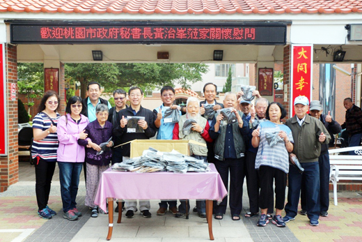 寒冬將近,桃園市政府秘書長黃治峯日前(30日)由桃園市浯江金門同鄉會創會理事長李寧源、創會監事陳松堅等人陪同蒞臨大同之家關懷慰問,致贈毛帽並祝福各位阿公阿嬤們身體健康。 主任楊志斌感謝黃秘書長等一行人的蒞臨,並特別邀請參觀大同之家園區,如家史館、孝親房、養護區以及介紹長輩平常活動的公共空間,讓各位貴賓深入的了解長輩們的生活環境及大同之家所提供之服務。黃秘書長對於大同之家在長者的照顧上無微不至、環境整潔優雅與服務的用心致為感佩,說會邀請桃園市長鄭文燦於明年來大同之家參訪。長者在寒冬裡,感受到黃秘書長溫暖的心意。