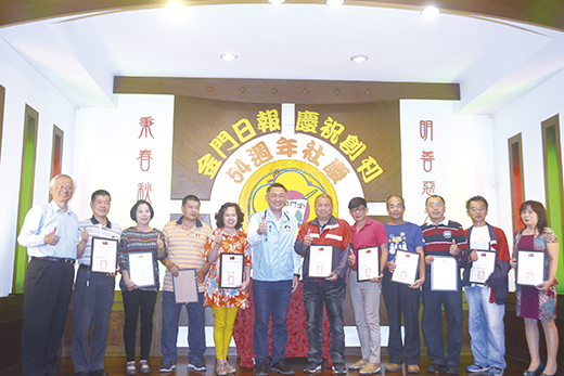 金門日報社昨日慶祝創刊54週年社慶,縣長楊鎮浯頒獎表揚資深績優員工,肯定他們對報社的付出。楊縣長說,金門日報創刊54年,紀錄金門過往生活、見證金門發展過程,是一部金門的歷史,也是金門最重要的精神糧食。楊縣長也希望報社團隊能隨著時代轉變,思考讓報社愈來愈好的方向,永續經營下去。 本報慶祝54歲社慶,昨日上午舉辦環境教育活動,全體職員工前往環保局參加環境教育研習課程,為員工充電。午間並舉行社慶餐會,讓全社員工可以共聚一堂歡度報社54歲生日。歷任社長陳金文、黃雅芬、陳大鵬、前參議陳炳仁、以及退休老員工也回娘家,和同事一起分享社慶的喜悅。 縣長楊鎮浯、議員楊永立、烈嶼鄉代會主席方駿洋、縣府觀光處長丁健剛、科長陳明伶、金酒工會理事長陳尚智等職業工會幹部也到場表達祝賀之意,受到報社職員的歡迎。 楊縣長頒獎表揚報社資深員工陳麗明(服務年資45年)、楊添壽、李惠娥、陳再生、陳志生、吳火來、盧清叻、鍾永盛(服務年資40年)、蕭志清(服務年資35年)、許瑞芬(服務年資20年),楊縣長肯定他們為報社付出大半生的歲月,工作表現良好。 楊縣長指出,一個機關或企業、報紙,走過半世紀多的歲月,真是不容易,金門日報創刊54年,一直扮演重要角色。楊縣長說,金門日報豐富多元內容,幾乎涵蓋金門人關心的面向,包括,學生寫作的學生園地、藝文界的藝文天地,鄉親關心的地方大、小事、以及社論提供縣政應興應革建言,金門鄉親所關心的面向,都可以在金門日報找到紀錄,為金門整體發展提供很好的參考。 楊縣長表示,金門日報是金門最重要的精神糧食,從以往戰地政務走過來到今日,見證金門每一階段的歷史,金門日報就是一部金門的歷史,記載著金門的發展和過程,也有著金門人的情感,以往網路還未普及,民眾每天一定要看金門日報,了解地方大小事情,已經是金門人生活的一部分。 楊縣長肯定報社員工堅守工作崗位,讓金門日報發展到今日的局面。楊縣長說,金門日報是台灣少數官方的報紙,承擔很多責任,在內容處理過程中會有很多綜合性考量,他上任以來,完全尊重金門日報專業的編採經營。至於員工擔心金門日報未來的走向,縣府關注的是讓報社經營更好的方案,不會讓這一份金門人的寄託,有任何不好的變化,重點報社也要有共識,隨著時代轉變,共同思考讓報社永續經營下去的方向。