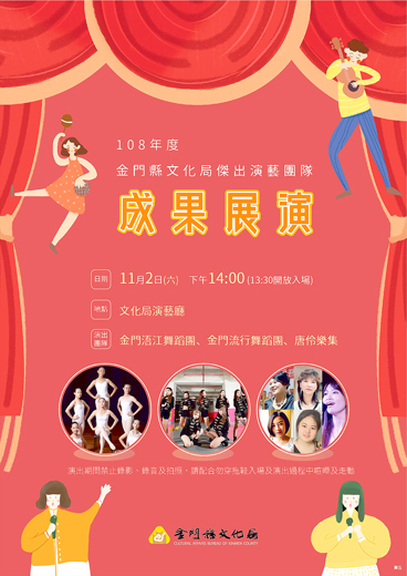 金門縣文化局辦理108年度金門縣傑出演藝團隊徵選,今年共有三個團隊獲選,分別為金門浯江舞蹈團、金門流行舞蹈團以及唐伶樂集。今天下午二時,於文化局演藝廳呈現在地團隊的成果(見圖),歡迎民眾蒞臨觀賞。 金門浯江舞蹈團,創於民國91年,長久以來藉著舞蹈藝術創作的力量來提升金門的地方形象,同時進行國際、兩岸的文化交流,塑造出金門縣第一個國際性的表演藝術團體。至目前為止,已赴香港及國內各縣市辦理巡迴演出計7場次,106年隨著金門縣政府遠赴南洋慰問金門華僑鄉親,完成「金廈兩岸舞蹈夏令營」活動計7屆,金門本地公演(含巡迴演出)計26場次,活動邀約演出超過100次。金門浯江舞蹈團將金門藝文流風推上國際舞台,讓世界認識金門。 金門流行舞蹈團,一個躍起於金門這座小島的流行街舞表演藝術團隊,成立於2011年3月1日,由團長李依文一手創立。為了讓街舞及流行舞蹈藝術能在金門永續發展,舞團在許多方面上都持續不斷地在耕耘;藝術的創新、多元藝術的相互結合、藝文活動的推廣以及培育優秀表演藝術專業人才……等不遺餘力,團隊的態度始終如一,同時,也在刺激藝術活動蓬勃方面不斷精益求精。 唐伶樂集,由地區愛好音樂藝術人員組成,並有金門大學合唱團、銘傳大學合唱團,以及地區中小學管樂團、國樂團、現代樂團加入演出行列,藉由豐富的藝術元素(音樂、舞蹈、歌唱),來呈現多元的藝術表演。 今年計畫除提經費供各團隊自我提升之外,文化局亦邀請專家學者來金門為各傑出演藝團隊的團隊營運、未來規劃等交換意見並提出建議。11月2日下午兩點整,邀請團隊於金門縣文化局演藝廳將今年的成果展現給大家。鄉親的進場以及掌聲,將會是金門藝文團隊持續茁壯以及前進的動力,歡迎大家蒞廳欣賞。 文化局提醒到場觀賞表演的民眾,為尊重演出團隊及現場觀賞之貴賓,本場演出禁止錄影、錄音及穿著拖鞋入場,請勿中途離席及於演藝廳內隨意走動。