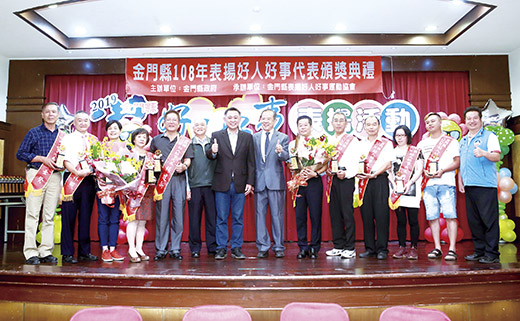 以維護傳統文化,弘揚博愛精神,表揚好人好事,推行國民心理建設,轉移社會風氣為宗旨,「金門縣一○八年度好人好事代表表揚大會暨感恩餐會活動」,昨(二十七)日上午在盈春閣餐廳舉行。縣長楊鎮浯親自到場頒獎給今年度獲選的各組好人好事代表。楊鎮浯對於獲選者們予以肯定,並希望他們的好人好事事蹟可以讓社會有更正向發展的能量,讓社會上更多人,見賢思齊,使社會發展更為溫馨和諧。會中,楊鎮浯也頒發當選證書給新任協會理監事人員。 由金門縣政府主辦,金門縣表揚好人好事運動協會承辦的這場好人好事代表表揚活動,於昨日上午十時起,在盈春閣餐廳舉行,縣長楊鎮浯、金門縣政府社會處長董燊、金門縣表揚好人好事運動協會理事長王水彰、榮譽理事長王添泉、該會理監事成員到場,向接受表揚的好人好事代表、家屬祝賀。 今年度當選「好人好事代表」者共計有五十人,包括社會組、大學組、高中職組、國中組、國小組,受表揚者身披「好人好事代表」榮譽彩帶,逐一上台接受台下觀禮者的祝賀,並自楊鎮浯手上接下表揚獎盃,及與家人們一同合影,分享榮耀。 楊鎮浯向獲表揚者致上恭賀之意,他說,好人好事表揚的活動代表社會上正向的力量,他肯定表揚好人好事運動協會的夥伴們平時積極致力於宣揚好人好事理念,希望社會有正向力量,楊鎮浯也特別向他們表示感謝。不論是在社會各角落、各崗位上努力拚搏的社會人士,或是在家庭中、學校裡的學生,他們將好人好事轉換成生命、生活的一部分,並落實在生活上,而非刻意為之,他感謝社會上有這樣的一群人,才能讓整體不斷向上發展。楊鎮浯並希望透過表揚者的事蹟來向外延伸,讓更多人體認到做好人、行好事的重要。 金門縣一○八年度好人好事代表表揚將表揚五十人,獲獎名單如后: 社會人士組: 楊川妹、陳金福、蔡壬癸、陳森照、黃明鸞、楊建新、翁文奧、李佩瑩、林再生、洪春棋。 各級學校組: 金門大學黃依晴、湯峻、梁育緹。 金門高中方蔚浚、黃郁庭、鄭祺東。 金門高職林芩卉、楊翊暄、蔡宗翰。 金城國中林伯謙、楊紫蓉、許銓恩、蔡其曄。 金湖國中呂育安、呂嘉軒。 金沙國中古銘宏。 金寧中小學邱慧文。 烈嶼國中林志玲。 中正國小吳宇捷、李冠毅。 金湖國小陳妤安、王冠鈞。 卓環國小洪苡瑄。 上岐國小洪晟艷。 西口國小洪苡茜。 金寧中小學李昭穎。 古寧國小李晶茗。 金鼎國小賴羿甄。 湖埔國小呂沅特。 古城國小辛香韻。 賢庵國小林瑀婕。 垵湖分校蔡謹言。 金沙國小黃亭云。 述美國小楊宇恩。 何浦國小張承恩。 安瀾國小黃宇澤。 多年國小關重釳。 正義國小陳采昕。 柏村國小陳可芯。 開瑄國小蔡宜安。 第九屆新任理監事人員為: 常務理事:王水彰、呂合成、薛辰汝、許金象、黃克標。 理事:陳忠飛、王添泉、林再求、林明鍊、許秋霖、吳龍山、陳秀玲、林莘恭、吳炯煒、陳再德。 監事:李國基、楊意金、楊赤玉、林金樹、邱華山。
