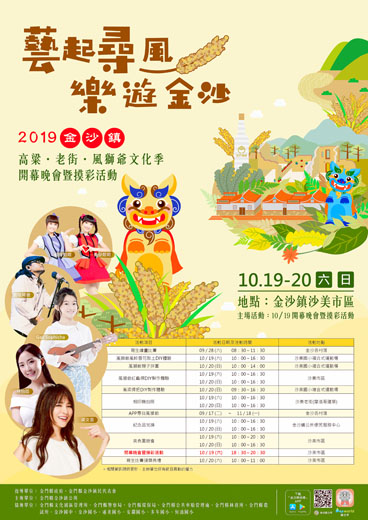 2019金沙鎮「高粱老街風獅爺文化季」即將於10月19及10月20日,上午10時至下午4時30分,假金沙戲院前辦理,期間推出打卡送園遊券好康,開幕晚會並邀藝人演唱及摸彩同樂。為服務鄉親於晚會散場提供接駁專車,9時10分自會場發車直達金城及金湖。敬請鄉親多加利用。而金門籍鄉親引頸期盼的「APP尋找風獅爺集點活動」兌獎,將自19日上午10日起開始受理,金沙鎮公所提醒,敬請鄉親兌領時遵照遊戲規則。 2019金沙鎮「高粱老街風獅爺文化季」規劃系列活動,除了APP尋找風獅爺集點兌獎活動,已熱烈進行中。包括,高粱掃把DIY、親子風獅爺風鈴雪花黏土、風獅爺紅龜粿DIY、相印機拍照、美食園遊會、開幕晚會暨摸彩活動等即將於10月19日以及10月20日,上午10時至下午4時30分,假金沙戲院前及金沙鎮公所週邊熱鬧登場。 10月19日有「風獅爺風鈴雪花黏土DIY」,時間10:00~12:00,下午1:30~4:30(中午休息),限額1800份,額滿為止。晚間則有開幕晚會暨摸彩活動,時間排定自6:30起,金沙鎮公所並訂於下午5時起至6時止,於現場發放摸彩券,限額3000張,發完為止。晚會將邀金曲歌王流氓阿德,林之王-林怡廷、聲林之王-gail以及梁文音等藝人和金門在地團體到場演出及互動,中間穿插摸彩活動,有機會將43吋液晶電視等大獎帶回家。 10月20日上、下午各有一場「風獅爺親子拼圖」,時間是上午10時及下午2時(採事先付費報名,已額滿),現場完成拼圖者將發送拼圖外框,當天未到者,主辦單位不會補送。「高粱掃把製作體驗(由農試所協辦)」,共計4場次,於金沙鎮複合式運動場辦理,採現場報名體驗,時間排定9:30~11:00,11:00~12:30,下午1:30~3:00,3:00~16:30,每場次活動前15分鐘開始受理報名登記,每梯次限額30人。而「寫生比賽頒獎」,將於上午10:00起公開頒獎表場,現場並有MOMO姊姊帶動唱跳表演。 除了上述動外,10月19及10月20日兩天皆有的活動計有五項,包括,「風獅爺紅龜粿DIY體驗」,每日分別為4梯次,上午10時、上午11時30分、下午2時、下午3時30分,每梯次12桌,每桌體驗人數為8人,請於現場報名參與。「相印機拍照」19日及20日上午10時至下午4時30分,於沙美老街現場,供鄉親排隊與打卡小物拍照,每人限拍一張。 「美食園遊會」19日、20日上午10時至下午4時分,與會商家計有,爆料雞排,珍的雞蛋糕、涼麵,榕園燒酒螺,李媽媽小吃,醬燒臭豆腐,烤鴨夾餅,四知味,金門ㄚ君生活館,九色霜淇淋,骨掌雞蛋糕,萱姐楷弟,樂多米香飽,合興餅家,金門烤肉刈包,九色醬燒雞排,香港雞蛋仔,黃家大腸包小腸,食神滷味,海灣拼布教室等20家(另有機關宣導攤位)。「打卡送園遊券」,民眾凡到金沙鎮公所1樓服務台,完成打卡(向工作人出示內容),即可兌換獲得30元園遊券1張,每日限量800張,送完為止。 另有「APP尋找風獅爺」兌獎,將於19日上午10時起一連兩天受理。鄉親凡於手機安裝活動APP,找尋金沙鎮65尊風獅爺,每一尊可獲得紅利點數55點;10尊旅行風獅爺,每一尊可獲得紅利點數300點。達到門檻後,即可依活動之規則,經現場經工作人員操作,扣除紅利點數,兌換活動限量紀念品。金沙鎮公所提醒鄉親,凡達到基本兌領門檻後,即可現場排隊兌獎,每人以2隻手機為限,每隻手機限1帳號,每項紀念品每1帳號限兌領一次,現場無提供wifi服務,敬請鄉親留意。而如需切換不同帳號,敬請鄉親重新排隊,數量有限換完為止。 金沙鎮公所表示,2019金沙鎮「高粱老街風獅爺文化季」系列活動即將於10月19日及20日一一呈現在鄉親眼前,廣邀民眾、遊客共襄盛舉,闔家來一趟與風獅爺相會的金沙人文之旅。19日晚會活動邀請多位藝人到場獻唱。由於會場管制停車,期間敬請鄉親多利用大眾運輸工具或共乘前往,晚會結束後亦協調車船處提供接駁專車服務,於晚間9時10分自沙美車站發車,直達金城車站及金湖車站(中間不停靠);敬請鄉親多加利用。