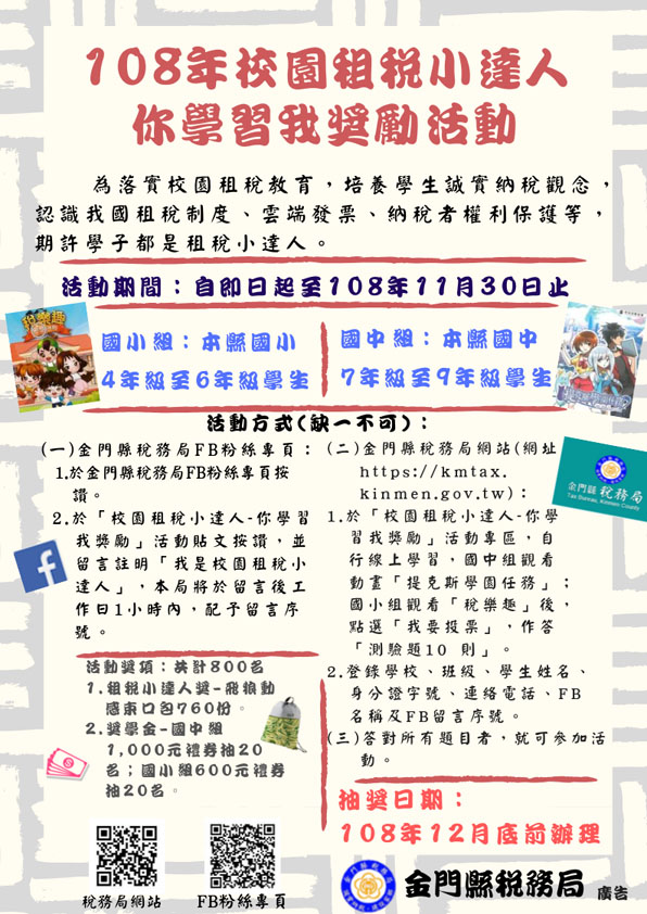 為落實校園租稅教育,培養學生誠實納稅觀念,認識我國租稅制度等,金門縣稅務局推動「108年校園租稅小達人-你學習我獎勵活動」,藉以宣導稅務常識,提昇學生對租稅基本認知,確立守法納稅及納稅者權利保護之正確觀念,期許學子都是租稅小達人,活動自即日11月30日止,計800份獎項名額,歡迎踴躍參加。 金門縣稅務局表示,參加資格對象為本縣國中及國小學生,分為國中組及國小組,國中組為7年級至9年級學生;國小組為4年級至6年級學生。活動方式(缺一不可)說明如下: (一)金門縣稅務局FB粉絲專頁:1、於金門縣稅務局FB粉絲專頁按讚。2、於「校園租稅小達人-你學習我獎勵」活動貼文按讚,並留言註明「我是校園租稅小達人」,稅務局將於留言後工作日1小時內,配予留言序號。(二)金門縣稅務局網站(網址https://kmtax.kinmen.gov.tw):1、於「校園租稅小達人-你學習我獎勵」活動專區,自行線上學習,國中組觀看動畫「提克斯學園任務」15分鐘;國小組觀看「稅樂趣」14分35秒後,點選「我要投票」,作答「測驗題10則」。2、登錄學校、班級、學生姓名、身分證字號、連絡電話、FB名稱及FB留言序號(不限學生本人之FB,但每一FB名稱及留言序號僅供一位學生登錄使用)。 答對所有題目者,就可參加活動,答錯者不得參加,每人限一次抽獎機會,重複者將予排除,登錄資料不實,逕予取消參加資格。 稅務局說明,本活動由學生自行線上學習,相關動畫影片置於Youtobe網站,搜尋「國中組-提克斯學園任務」或「國小組-稅樂趣(密室逃脫)」即可觀看,亦歡迎各校利用統一播放。活動獎項共計800名,分別是租稅小達人獎(飛狼BRUSH動感束口包)760名及獎學金40名,國中組1,000元禮券抽20名;國小組600元禮券抽20名。抽獎日期訂於108年12月底前辦理,租稅小達人獎及獎學金,同一學生可並得,歡迎國中及國小4年級以上學生踴躍參加。