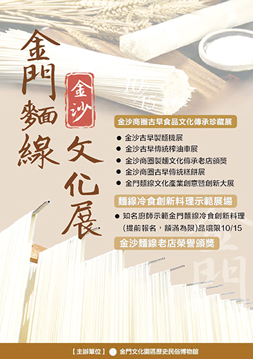 金門文化園區管理所將辦理「金門麵線文化展」,除了將展出有金沙鄉親所捐贈之金門百年製麵機、傳統榨油車,亦有金沙商圈傳統糕餅展,金門麵線製作流程示範,期藉以帶領民眾認識金沙商圈麵線及古早味糕點故事,傳承老店味道。現場規劃「冷熱食創新示範」品嚐體驗活動,限額30人,即日起受理報名,額滿為止,報名請洽0907691033或0823-25206,詹小姐。 金門文化園區表示,歷史民俗博物館訂於10月15日起辦理「金門麵線文化展」,預訂上午10:00在博物館開幕。特別規劃並邀請「金門百年製麵機珍藏開幕展」、「金沙商圈麵線文化傳承老店頒獎」、「傳統榨油車捐贈珍藏展」、「金沙商圈傳統糕餅展」、「金門麵線文化產業暨創新大展」。並將邀請捐贈者,金沙鄉彥黃奕文(捐贈其父黃順良曾使用之百年製麵機),張炳煒、張可畏(捐贈傳統榨油車)與會,並有傳統糕餅展,將展示寸棗糖、花生■、芝麻■、米香、一口酥、牛軛餅等,以及金門麵線故事、金門麵線製作與特色、製作流程、傳統金門麵線吃法、產業創新等,歡迎民眾報名體驗品嚐30人為限,額滿為止。請洽0931599134石小姐。 文化園區管理所也指出,「金門麵線文化展」中還將同時舉辦一項「冷熱食創新示範」,將於10月15日(二)上午10:30-11:30舉辦,將邀請知名廚師示範金門麵線冷熱食創新料理,即日起報名,額滿為止,名額30人(以提供現場體驗品嚐為限)報名專線:0907691033或0823-25206,詹小姐。 文化園區管理所指出,活動由文化局、金沙鎮公所指導,金沙商圈產業發展協會協辦。「麵線」是金門地方特產,亦是兩岸閩南人,尤其是金門常民美食文化。博物館期能結合社區生活資源,以「生態博物館,常民市集」理念,與常民文化和在地產業創新發展,喚起有味道的金門情感記憶。故規劃舉辦「金門麵線文化展」,會中展示金沙半世紀傳統製麵機、傳統榨油車、金沙商圈傳統糕餅展,金門麵線創新大展與冷熱食創新示範等,期能以具有文化傳承與市場開拓性之「金門民俗美食文化品牌」,帶動金門觀光及特產創新發展,促進兩岸閩南文化交流,歡迎民眾踴躍參與。