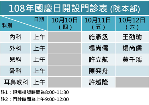 因應雙十國慶連假的到來,衛生福利部金門醫院調整10日至12日期間的門診,請有就醫需求的民眾留意。提供地區民眾牙齒問題的就醫選擇,自10月15日起,三軍總醫院及台北榮總牙科部支援金門醫院院本部暨烈嶼院區牙科業務,有需求的民眾可多加利用。 金門醫院於國慶連假期間院本部門診調整如下,10日停診,11日上午內科、外科、兒科、骨科、耳鼻喉科有醫師看診,12日上午內科、外科、兒科接受民眾就醫,急診在連假期間二十四小時開放。現場掛號時間為上午8時至11時30分,門診時間為9時至12時。 另外,自10月15日起,三軍總醫院及臺北榮總牙科部支援金門醫院院本部暨烈嶼院區牙科業務,歡迎有需求的民眾可多加利用。三軍總醫院支援烈嶼院區週二及週三上、下午的門診,臺北榮民總醫院支援院本部週四及週五上、下午的門診。