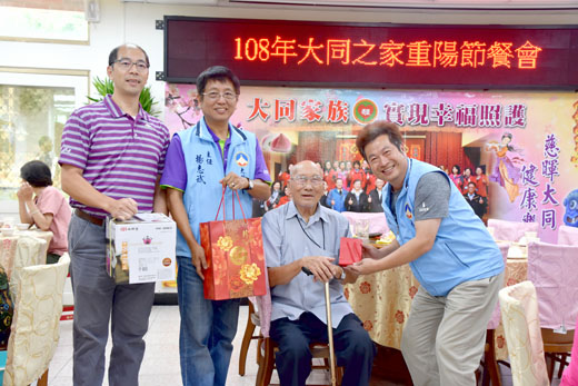 詹宗翰/圖文 昨日為農曆九月初九重陽節,大同之家和機構內的長輩一起溫馨共度。縣府更送上祝賀的重陽敬老酒給九十歲以上的長者,祝福大家健康長壽。 社會處處長董燊、金寧鄉主任秘書蔡世舜、金城鎮秘書陳欽進、金湖鎮社會課課長林蔚尚、慈暉志願服務隊等人昨日各代表縣政府、金寧鄉、金城鎮、金湖鎮等地方政府機關向大同之家內的長者們問安。縣府為這眾多長者聚會的場合送上加菜金,還送給機構內九十歲以上長者重陽敬老酒,贈與金鎖片給百歲以上的長者,以及送給他們方便自炊的電鍋。