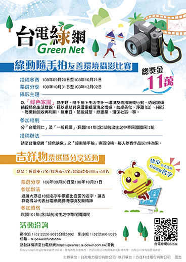 「台電綠網」為台電公司就環境友善作為與社會大眾溝通之平台,並為推廣綠色行動並鼓勵民眾隨手做環保,自即日起辦理一項「台電綠網吉祥物命名票選暨分享、綠動隨手拍攝影比賽」活動,金門縣政府建設處發布參加辦法及歡迎一般民眾踴躍參與,有獲得最高一萬六千元禮金或抽取節能獎品的機會,以及一同為環境努力,匯集台灣邁向環境永續的動力。 此項比賽參加對象分一般民眾組,限民國101年(含)以前出生之中華民國國民(約七歲以上)參與及台電同仁組(台灣電力公司在職同仁),並需先註冊成為台電綠網會員,活動內容為: (一)、「台電綠動隨手拍」友善環境攝影比賽:以「綠色家園」為主題,即日起至十二月二日,隨手拍下生活中任一環境友善措施或行動,並票選及分享優良作品,有機會獲得最高一萬六千元禮金。 (二)、「吉祥物命名票選暨分享活動」:為具體建立「台電綠網」專屬識別形象,即日起至十月二十一日,凡為「台電綠網」吉祥物票選合適名字並分享者,有機會抽取折疊車及快煮壺等節能獎品。 另,其活動徵稿期間自今年九月二十日至十月廿一日止,於徵稿活動前拍攝的照片亦可投稿,攝影主題以「綠色家園」為主題,隨手拍下生活中任一環境友善措施或行動,透過鏡頭捕捉綠色生活樣貌,藉以連結對保護家鄉環境之情感,如綠美化、淨灘(山)、掃街、廢棄物回收再利用、無車日、節能減塑、綠建築、環保社區……等。 參賽作品投稿登入會員後,至台電綠網「綠色映像」之「綠動隨手拍」專區投稿(https://greennet.taipower.com.tw/),每人參賽作品以一件為限,時限內可無限制上傳照片,惟以最後一張作為參賽作品,得獎名單將於今年十二月十日公布於活動網站,並於十二月十三日前以獲獎人於綠網登錄之電子郵件通知獲獎相關事宜,資訊不正確者將取消其領獎資格。 還有在票選活動期間,投稿作品經評選各組擇前十名進入網路票選,共二十組作品;每人可從「台電同仁組」及「一般民眾組」各擇二票喜愛的照片(同一組別可投給同一個喜愛的作品二票)。另,分享活動:(一)、綠網會員可透過活動網站內崁的社群分享軟體(Facebook、Twitter、Line等)將票選活動連結分享給親朋好友。(二)、每位會員每日限進行一次分享活動訊息,分享成功則獲得一次抽獎機會,分享天數越多,中獎機會越大(活動詳情請至網https://greennet.taipower.com.tw查詢)。