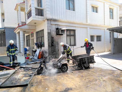 金寧地區驚傳出一起住宅機車火警,昨(26)日上午於下埔下村莊一棟二樓房屋外側機車忽然起火並冒出大量濃煙,火勢一發不可收拾,所幸消防局職義消人員到達及時將火勢控制並撲滅,現場無人員傷亡。 位於下埔下村莊內的這棟民宅,因屋主為弱勢家庭,家中並沒有任何其他人員,僅1人居住,因身體不便而有一輛殘障機車,此次遭火舌吞噬幾乎完全燒毀。這起火警發生也讓屋主驚嚇手腳發軟,一臉驚悸猶存,幸好沒有因火災造成受傷。 消防局指揮中心接獲報案後,立即派遣轄區金寧及金城消防車4輛、救護車1輛及消防人員14名馳往救災,由第一大隊大隊長陳國瑋親自到場指揮坐鎮,附近鄰居也熱心幫忙引導,但由於火勢凶猛,加上機車內儲油,也導致火勢在瞬間竄起並迅速燃燒,現場濃煙密佈。消防人員到達現場後,發現屋外火勢猛烈燃燒,夾雜牆壁電表爆裂聲,立即迅速佈水線搶救,經搶救人員冒險全力進行搶救下,火勢迅速撲滅。 這起火警計燒毀一個電表、牆壁磁磚剝落,一輛殘障機車全毀,其他財物損失尚估計中,起火原因正由消防局火調科進行鑑定調查中。火警一度引起附近居民好奇圍觀,有的居民看到消防車還以為是火燒埔,後來得知是住宅前機車火警,在親自目睹機車整台燃燒且燒得焦黑一片後,不禁怵目驚心,但也慶幸屋主本人逃過一劫,並紛紛向屋主表達關懷之情。