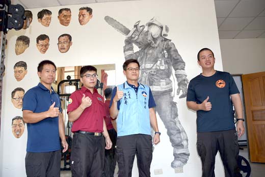 金湖消防分隊一位替代役男楊勝博,在即將退伍之前,發揮他的繪畫專長,在消防隊重訓室的牆壁畫上15位金湖消防隊學長的大頭照,有的表情嚴肅、有的故作鬼臉,畫得十分生動;楊勝博另外又畫了一幅真人大小的消防員全副武裝素描圖,十分英挺霸氣!栩栩如生的作品也為楊勝博退伍離開金門之前留下美好的紀念。 金湖消防分隊195梯替代役男楊勝博,服役時發現重量器材訓練室有許多空白牆面,主動要求美化,為分隊增添顏色,他首先以素描技法在水泥油漆牆面畫出寫實的「消防搶救猛男」,後續繪製職消同仁大頭照,細節之細膩,畫像之生動,令人嘆為觀止。楊勝博將消防同仁救災形象化身英挺霸氣的壁畫,讓分隊重訓室從此成為另類焦點。 今年26歲的楊勝博是新北人,畢業於台灣藝術大學,熱愛美術創作,因緣際會下來到金門服消防替代役,開啟嶄新的人生詩篇,107年底到金湖分隊服役,主動要求繪畫牆面,時任分隊長潘妍廷及續任分隊長林政宏均表支持,讓他在勤務之餘作畫,除了美化空間,也為生硬的公務機關增添溫馨。 楊勝博本身就有繪畫專長,在短短的服役期間與分隊同仁建立良好情感,同時也對救人於水火的消防工作頗為認同,在短短的服役期間主動幫分隊重訓室彩繪牆面,第一幅以全副武裝、手持搶救器材的消防猛男為主題,運用素描技法及繪畫專長,作品完成後其細膩及逼真的程度,初見之人多誤以為海報或沖印作品,近看才發現,不敢置信,竟然是用手繪的!越趨近看,越是發現畫作之精細,舉凡光影、線條、皺褶、物品細節等無一不細緻呈現,真是佳作。 後續楊勝博又構思以分隊職消同仁頭像為主題,加以自身技法,揮灑出色彩、表情、肌肉紋理的搭配,呈現逼真,充滿童趣,而又充滿美感氣息的作品,讓空間更加活潑,也為自己消防役生涯留下美好紀念。 楊勝博說,消防猛男作品花費他1個月構思,14天才完成,雖然只是素描線條和色澤,但是平常看到救災時消防學長出勤的辛苦,很希望能呈現搶救的特有英姿。楊勝博說很開心能在服役期間留下紀錄,擔任消防替代役讓他更了解消防隊工作,體認辛苦一面。 消防局長翁宗堯表示,許多替代役男本身都有個人專才,消防局皆會協助發揮所長,在消防領域擴展不同事業,將個人所學與消防工作相互結合,像是有運動背景的役男可以協助指導同仁專業體能訓練、醫護背景可協助救護工作等。