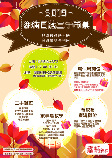 金門縣環保局與「金門布尿布交流社團」為推動二手物流動,賦予二手物品新生命,鼓勵大家將家中用不到且保持良好卻又捨不得丟掉的二手物拿到市集中拍賣,特於今(21)日晚間5時至8時在湖埔村辦公處前廣場(金寧鄉湖下155號之1號)舉辦「湖埔日落二手市集」,歡迎大家到場參加。 環保局表示,活動現場預計有20個攤位提供3C小物、童鞋、幼兒用品、生活用品、飾品及書籍等多樣二手好物品等你去選購,該局在活動當天將設有專屬攤位進行愛心袋兌換購物券活動,鼓勵民眾將家中多餘且可再利用的購物袋或紙袋攜至環保局攤位,5只袋子(購物袋或紙袋)可兌換二手市集購物券10元(一人限兌換一次,數量有限兌換完為止)。 環保局表示,「湖埔日落二手市集」現場將有「金門布尿布交流社團」教導大家正確使用布尿布,幫助減少縣內垃圾產生。此外於活動當晚6時30分至7時、7時30分至8時並舉辦兩場次「家事皂教學」活動,參與教學就有機會獲得精美小禮物!(數量有限送完為止)。 環保局說,為促進縣內二手物流動以及資源有效再利用,並且幫助民眾去化家中閒置物品同時提供大眾購物與惜物樂趣,特舉辦「湖埔日落二手市集」,歡迎大家共襄盛舉,賦予二手物嶄新生命,共創永續環保新生活。