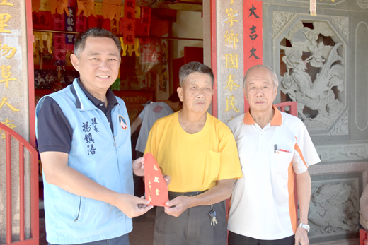 李金鎗/圖文 農曆八月廿二日是奉祀神祇「廣澤尊王」聖誕,金寧鄉古寧村北山鎮東宮舉行醮慶儀式,縣長楊鎮浯(如圖)、議員李養生及金寧鄉所會主管均前往上香祝賀、敬獻爐敬金,祈祝地方風調雨順、平安和諧。 昨日是「廣澤尊王」聖誕千秋,金寧鄉古寧村北山鎮東宮舉行醮慶儀式,縣長楊鎮浯於上午十時在縣府民政處長陳世保、港務處長何佩舉與地政局副局長呂清福等人陪同下前往拈香祈福,隨後議員李養生、金寧鄉公所秘書王四川、代表會副主席楊水信也代表該單位首長前往上香祝賀、敬獻爐敬金,祈祝地方風調雨順、平安和諧。受到主委李再杭與長老的歡迎與感謝。