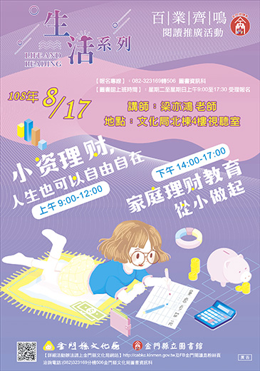 金門縣文化局辦理金門閱讀島「百業齊鳴│理財講座」閱讀推廣活動講座,於8月17日(星期六)分上、下場二場,上午場9至12時「小資理財,人生也可以自由自在」、下午場2時至5時「家庭理財教育從小做起」,於金門縣文化局北棟圖書館四樓視聽室辦理。8月9日起於圖書館上班時間(星期二至星期日上午9時至下午5時30分)受理電話報名,額滿為止,報名專線082-323169#506圖書資訊科,歡迎民眾踴躍報名。 上午場「小資理財,人生也可以自由自在」,時機不好錢難賺,在高物價、低薪水時代,想要甩掉貧窮,不只要拚賺錢、會存錢,更要懂得理財規劃、趁早做好資產配置,並以適當比例分散投資,才是捍衛財富的唯一方法!資產配置就是未雨綢繆,幫我們擺脫錢不夠用的循環,避免將來成為沒有保障的「老人」!拒當青貧族,做好資產配置,了解常見資產配置工具,退休生活不用靠老闆、不用靠政府,自己的退休金自己救。 下午場「家庭理財教育從小做起」,在美國,父母希望孩子早早就懂得自立、勤奮與金錢的關係,在教育孩子理財方面,的確有著獨到之處,視理財教育稱之為「從三歲開始實現的幸福人生計劃」。建立理財投資的正確觀念,理財也成為了現當代父母培養孩子的一大重要課程。講座上老師將協助父母如何教導理財教育,讓孩子從小在生活日常中學到理財相關知識。 此次活動邀請梁亦鴻老師,梁老師是精進財商顧問股份有限公司副總經理,國立台北商業大學兼任助理教授,並是「三天搞懂系列」財經暢銷書作家,具豐富的教學以及業界經驗,擅長將繁複的投資觀念「化繁為簡」。 文化局表示,藉由活動鼓勵民眾至各圖書館借閱相關書籍,活動現場也將提供相關書籍給予民眾借閱,更歡迎民眾現場提出問題與老師現場討論。活動詳情請上「金門閱讀島」臉書。