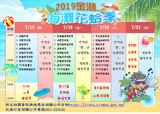 2019年「金湖海灘花蛤季」將於7月18日至20日在成功海灘舉行,每天活動從下午16時開始直到晚間約22時,每日都有不一樣的精彩活動。今年首度新增「打西瓜比賽」、「親子同心協力賽」以及小朋友保證愛的「泡泡戲水池」,可望將花蛤季人潮再衝上高峰,暑假無處去,歡迎爸媽帶小朋友來花蛤季放電! 今年金湖花蛤季首日訂於7月18日(週四)舉行,除了每年都有的沙雕比賽外,今年首度新增「打西瓜比賽」,勢必吸引民眾搶先體驗。當晚19時開始則有「HIGH一夏演唱會」,邀請吳汶芳、陳零九、小宇、丁噹等歌手輪番演唱。 花蛤季第二天7月19日(週五),當日活動包括每年的沙灘躲避球比賽、吃西瓜比賽,今年新增「親子同心協力賽」,讓爸媽和小孩們可以一起玩遊戲。當晚19時開始有「第13屆金湖鎮歌唱大賽」,由15位晉級決賽的歌唱好手上台大展歌喉,冠軍可獲得獎金1萬5000元。當晚壓軸邀請到剛以《希遊記》專輯獲得金曲獎最佳國語專輯大獎的歌手孫盛希為大家帶來演出。 花蛤季第三天7月20日(週六),當日活動有千人魚苗放流、沙灘排球比賽,以及每年競爭激烈、經典的呷冰大賽。當晚19時開始有「第8屆花蛤小天使選拔賽」,由16位晉級決賽的小朋友上台表演才藝,冠軍可獲得獎金3萬元。當晚壓軸邀請到歌手曾沛慈帶來表演。 金湖鎮公所表示,花蛤季期間7月18日至20日,現場都有打卡按讚送好禮、氣墊城堡、沙灘牽罟活動、親子DIY體驗、XO干貝醬及蛤貝類料理品嚐、觀光市集等活動,今年配合炎炎夏日,更新增「泡泡戲水池」,保證讓小朋友玩到瘋掉。7月21日則有台灣原住民豐年節在成功廣場舉行,當天仍有花蛤季觀光市集持續到晚上。