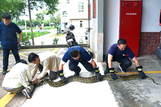 一條近四公尺的緬甸蟒在古寧村慈湖農莊農舍偷吃雞鴨,辛姓主人發現後昨日清晨向消防局報案請求協助。金寧消防分隊抵達現場後,費了好一番功夫才以捕蛇器將巨蟒蛇制伏。並依相關規定通報金門縣政府建設處農林科進行後續的收容處置。 金門縣消防局金寧消防分隊表示,昨日上午接獲指揮中心通報在古寧村慈湖農莊十號農舍的禽畜養殖空間有一條蟒蛇,立即出動消防人員前往處理。三人抵達現場時發現這隻蟒蛇躲在儲放農具的農舍內。不過消防隊員從蟒蛇肚子凸起研判,牠應已吞噬不少隻雞。消防隊員先用繩子套住蟒蛇頭部,由於兇猛的蟒蛇使命掙脫,三名消防人員費了好一番功夫,才制伏蟒蛇將它放入捕蛇袋裡。 據辛姓農民表示,昨日一早前往餵雞時,發現平時養的土雞又少了很多隻,附近農民也表示最近雞鴨都會遺失,並在牆角聽到不明聲響,一大早就請古寧村長李開陣協助報案,同時二人也在農舍內將雜物移出,最後發現一條緬甸蟒躲藏在雜物間,經報案請消防局人員趕到現場協助。 金寧消防分隊表示,分隊是在昨七日上午七時四十分獲報後趕到現場,由隊員雙手穿戴消防手套圍捕大蟒蛇,蟒蛇受到驚嚇急於逃竄,隨即將腹中的雞隻六隻吐出來,隊員馬上用捕蛇袋套住頭部,兩名隊員合力將長約四米的蟒蛇套進捕蛇袋裡,帶回金寧消防分隊,為農舍主人解決心中大患,飼主也相當感謝消防員的協助。 消防隊捕獲該大蟒蛇後將轉交給建設處農林科,昨日下午農林科鐘立偉科長到消防分隊後,請金門縣野生動物救援暨保育協會獸醫協助量測,該蟒蛇體長383公分、體重24.3公斤、雌性,是金門近年開始進行蟒蛇相關研究發現紀錄最長蟒蛇,因長度超過三米半將不會野放,將交由金門畜試所或台灣動物園收養。 另金城消防分隊7月5日獲報在舊金城酒廠週邊雞舍有緬甸蟒入侵,出動消防人員前往處理制伏。經金門縣野生動物救援暨保育協會獸醫協助量測,該蟒蛇體長193公分,體重3.9公斤,吞了一隻母雞。 農林科鐘科長指出,緬甸蟒主要的食物以小黃腹鼠與溝鼠為主,每隻亞成蛇,年可進食約兩百五十隻老鼠,對於控制鼠類族群增長上有相當的生態價值;另由於冬季低溫及食物來源等問題,緬甸蟒的族群受到自然限制,個體及族群都很難有大規模成長的機會。 鐘科長說,依近年農委會林務局與縣府相關研究及通報資料顯示,金門由於四季氣候變化強烈,春夏兩季的緬甸蟒在夜間移動,秋冬因氣溫過低,蟒蛇會在白天出沒並在花崗岩石等空曠區域吸收陽光熱能,反而有較高的通報率,出現均屬正常現象,民眾不必恐慌。同時提醒鄉親若在野外發現緬甸蟒可聯絡縣府農林科處理,或通報119協助處理,以免發生危險。