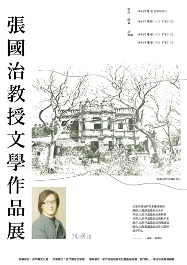 金門睿友文學館閱讀島推廣活動計劃,本年度繼「陳長慶文學作品展」(1-3月)、「金門現代文學作家手稿暨著作聯展」(4-6月),第三檔「張國治教授文學作品展」(7-9月),將於七月三日下午2:30舉行開幕儀式。睿友文學館為響應環保,不另寄送邀請卡,屆時歡迎鄉親及各界人士踴躍前往參加,為此次活動共襄盛舉。 此次展出張國治教授歷年創作之部份手稿、著作及相關資料,內容豐富、精彩可期。張國治並將現場朗誦新詩數首,主辦單位亦將邀請金門仙洲薪傳南音社,在開幕時演唱多首南音名曲,為活動揭開序幕。 擔任此次活動展覽者張國治教授,1957年生於金門金城,1978年畢業於國立臺灣藝術專科學校美術工藝科,1988年畢業於國立臺灣師範大學美術學系獲文學士學位,1994年畢業於美國芳邦大學(Fontbonne University) 獲藝術碩士學位。2016年獲福建師範大學美術學專業文學博士。曾任國立臺灣藝術大學視覺傳達設計學系教授兼系主任及研究所所長,文化創意產學園區文創處處長,推廣教育中心主任。現為國立臺灣藝術大學視覺傳達設計學系專任教授及創意產業設計研究所博士班教授,碩博士導師,指導近 60餘位碩士研究生獲得學位。2010年起獲聘為廈門大學、華僑大學客座教授。 張國治曾得過20餘次的文學、美術獎項。美術獎項如師大美術系畢業美展水彩第二名。文學如浯潮文學獎新詩、散文等首獎、國立藝專文學獎、師大現代文學獎新詩首獎、散文第二名等校內文學獎。1987年以〈眼淚總會遞給我一首歌〉獲第七屆全國學生文學獎大專新詩組佳作。1988年以〈帶你回花崗岩島〉獲第八屆全國學生文學獎大專新詩組首獎,1989年榮獲中國文藝協會全國優秀青年詩人獎,中國文藝協會文藝獎章,以〈一顆米如是說〉、〈孩子讓我慢慢向你說〉連續兩年獲臺灣省政府糧食局推廣米食詩歌比賽佳作。連續兩年獲台北公車暨捷運詩文獎,1991年以〈奔向歌聲〉獲教育部八十年文藝創作獎教師組新詩項目第二名,2008年以〈你是我1G的記憶卡〉、〈初冬一日為母親放相〉、〈涼意〉等三首獲教育部文藝創作獎新詩項目佳作,臺灣省政府新聞處贊助出版優良文藝作品等獎項。其詩作多次獲選入臺灣「年度詩選」,遠流「天下詩選」,九歌版「中華現代文學大系」、「新詩300首」、「航向福爾摩沙」(中、英譯本)、「閱讀文學地景」(文化部、聯合文學)、「金門現代詩人」(情書出版社)……等各種重要選集。詩作更被翻成英、日、韓、南斯拉夫等多國語言。 張國治著有詩集:「三種男人的情思」、「雪白的夜」、「憂鬱的極限」、「帶你回花崗岩島│金門詩鈔.素描集」、「末世桂冠-中詩英譯.版畫集」、「張國治短詩選」、「戰爭的顏色」、「歲月彩筆」、「無以名之的風景-張國治詩畫集」、「紋身-張國治詩畫集」共十冊,散文集「愛戀情節」、「濱海劄記」、「家鄉在金門」、「藏在胸口的愛」、「寫給金門的一封信」共五冊,評論集「金門藝文鉤微」以及攝影集「暗箱迷彩│張國治視覺意象攝影」、「由黑翻紅│張國治2009攝影集」等共十八冊;新作「精神還鄉的時節」將由金門文化局補助出版,可說著作等身。 張國治除文學與藝術成就外,亦曾獲選為金城國小、金城國中、金門高中傑出校友,桃園縣特出優良教師,教育部40年資深優良教師等殊榮,為活躍於兩岸三地的著名詩人、藝術家及學者,受邀赴各地演講的場次不計其數。此次在百忙中返鄉舉辦文學作品展,更是他愛鄉愛土回饋鄉土的展現,鄉親及藝文界人士均給予高度的肯定。本次活動將由中國文藝協會常務理事、中華民國新詩學會理事王婷小姐擔任主持人。