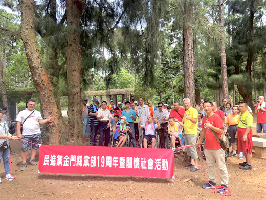 民進黨金門縣黨部慶祝成立十九周年,於昨(一)日上午在中山林舉辦「關懷弱勢活動」,邀請晨光教養家園與福田家園六十餘位園生於中山林享受森林浴,並在松樹林下野餐。難得有機會出外踏青,黨員與園生們熱情互動,園生們更意猶未盡的說希望下次還要再來。 民進黨部主委吳增允昨日一早就率領執行長許可昕與黨部幹部和志工,備齊訂購的漢堡、餐盒及各式冰涼飲料,先行前往中山林布置,並等候晨光教養家園與福田家園園生到來。 民進黨金門縣黨部主辦的黨慶暨關懷弱勢活動,商請金門國家公園管理處協辦,除邀請園生共襄盛舉外,行政院金馬聯合服務中心執行長翁明志、金沙鎮民代表何開忠、金湖鎮民代表洪海水、金門國家公園管理處副處長蘇承基等人也到場致意。 主委吳增允認為,政黨成立除了堅持理念,更應致力社會公益、關懷地方弱勢族群。過去幾年民進黨金門縣黨部陸續舉辦邀請晨光教養家園與福田家園的園生到金城鎮摩斯漢堡店品嘗漢堡、前往台開金獅影城欣賞電影等活動,除希望回饋社會外,也藉活動讓平日難得外出的園生們能外出踏青、舒展筋骨,並讓他們有機會接觸社會、融入社會。 吳增允並感謝福田家園主任陳長源等工作人員,協助安排輪椅及復康巴士等交通工具,熱心的帶園生們出來參與活動。 金管處副處長蘇承基肯定黨部取之社會、用之社會的用心;並表示該處福利社結束營業時,結餘一百多萬元也是捐助給晨光教養家園與福田家園,並歡迎園生有機會再多到中山林踏青遊憩,金管處也會給予相關協助。