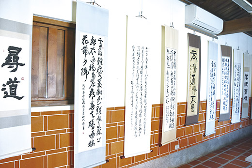 跨進燕南山太文巖寺,清風中傳來蟬聲高唱,由金門書法學會和彰化游藝雅集書學會合辦的「蟬聲夏語」金彰書畫交流展,刻正於寺中兩側的廂房展出,展期到七月十四日止,歡迎蒞臨觀賞。 2016年首次舉辦的「蟬聲夏語」,今年是第四度金門和彰化的書畫界合作,同樣匯聚了書畫家們的精彩作品,各式書體兼備,在古意的空間中展出,更顯高雅。書法家們書寫著喜歡的字句,李白「將進酒」、劉禹錫「陋室銘」、王維「竹里館」、王之渙「登鸛雀樓」、李後主「漁父詞」、「菜根譚」、「心經」……皆成為書法家筆下的好作品。吳秀停作品「不驚、不怖、不畏」,三個「不」字寫法各異,各有其趣。展出作品中的黃庭堅「荊州即是藥名詩」,巧妙的將藥名嵌進詩句裡。 此次參展的書法家有洪文圳、葉志國、葉偉世、鄭世杰、曾承鴻、吳秀停、涂慧玉……等人,共展出逾三十幅作品。