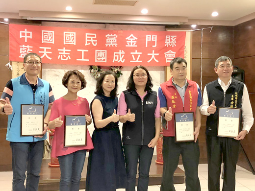 金門縣國民黨藍天志工團昨舉行成立大會,活動假葡京餐廳舉行,由志工團總召集人、國民黨主席吳敦義的夫人蔡令怡代表頒聘書並授旗予立委陳玉珍,藍天志工團金門支團正式成立,聘陳玉珍等人擔任金門縣支團團長及鄉鎮分團團長職務,希望藉由金門在地支持的力量,讓國民黨於明年重回執政。 該活動邀集了總統府資政趙守博、烈嶼鄉代會主席方駿洋、副主席吳福全、金寧鄉代會主席莊振源、代表李琳瑯、黃文欣、金湖鎮代會代表林嘉森、金沙鎮代會代表呂寶玉……等人,以及台灣工商企業聯合會會員五十餘位,和來自各鄉鎮的志工共同出席。會中頒發聘書給予陳玉珍,聘其為金門支團團長,聘方駿洋、莊振源、林嘉森、周水土、陳天成擔任鄉鎮的分團長。 陳玉珍感謝鄉親的支持,自認就任立法委員以來兢兢業業,在醫療、交通、選民服務諸方面皆全心全力的服務。她表示國民黨藍天志工團的成立宗旨,正如金門人一樣是博愛、樂善好施的,志工團會竭誠為鄉親服務。蔡令怡指出,工商企業聯合會成員來自全球,陳玉珍也加入此組織,藉金門支會成立,邀工商聯成員到金門一遊,彼此聯絡感情;志工團是無給職,活動又要出錢出力,感謝願意站出來承擔的眾人。 國民黨藍天志工團於去年一月成立,由國民黨主席吳敦義出任總團長,設置目的是為了關懷國民黨員與增進和友好人士(包含海外僑胞、台商及民間有關社團)的關係,以爭取對國民黨的認同,而經費來源以勸募自籌為原則。