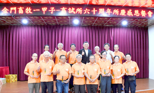 「金門畜牧一甲子」金門縣畜試所昨日舉辦60週年所慶感恩餐會,現場貴賓雲集,歷任所長以及地區各界一同獻上祝福。縣長楊鎮浯也出席活動並頒獎表揚蔡水聘等十餘位資深員工。楊鎮浯表示,畜牧一甲子,感謝歷任所長、每一位員工的努力及中央支持下,為地區畜牧產業奠定基礎。未來的畜試所,在核心業務、觀光休憩、加工部門,以及水獺收容中心等整體規劃下,將可成為具環境生態及觀光休閒等多元功能之場域。 慶祝畜試所成立一甲子,昨(28)日也舉辦研討會,邀請行政院農業委員會畜產試驗所所長黃振芳博士、行政院農業委員會畜產試驗所恆春分所分所長陳嘉昇博士、行政院農業委員會畜產試驗所花蓮種畜繁殖場場長蘇安國博士與行政院農業委員會畜產試驗所產業組股長蕭宗法博士與會講授,分析產業發展之各項重點,也提供建言,期有助於地區畜牧產業的發展與進步。 畜試所並於昨晚假紅龍餐廳舉辦60週年所慶感恩餐會,表揚資深員工。現場貴賓雲集,包括縣長楊鎮浯、立委陳玉珍、議員李養生、李應文、蔡水游、金湖鎮鎮長陳文顧、歷任所長、縣府團隊以及畜試所員工等出席。並由縣長楊鎮浯頒獎表揚資深員工,包括,服務滿40年以上:蔡水聘、鄭金水、呂絲金、及黃志雄。服務滿30年以上:蔡錫仁、陳水能、辛園茂(課長)、鄭有晉、許加(課長)及郭一彥。服務滿20年以上:蔡遠見、呂振立、蔡惠英及楊肅權。 縣長楊鎮浯指出,提及畜試所就想到兒時到牧馬場郊遊的經驗,迄今仍印象深刻。畜試所成立60週年,金門畜牧一甲子,感謝歷任所長、每一位員工的努力及中央支持下,為地區畜牧產業奠定基礎。近期畜試所在許績鑫所長帶領下,在即有基礎上增加許多延伸性、互動性發展,期盼畜試所未來應該在核心業務、觀光休憩、加工部門,三位一體下,加上水獺收容中心等規劃,朝具環境生態及觀光休閒等多元功能之場域發展。 政院農業委員會畜產試驗所所長黃振芳博士指出,60年不容易,在中央、地方歷任長官及每一位第一線同仁努力下,為畜試所奠立下良好基礎。誠如楊縣長所言,畜試所未來走向融合畜產、觀光、加工甚至保育教育等功能,相信畜試所將大有可為,也代表農委會祝賀金門畜產試驗所60週年生日快樂!
