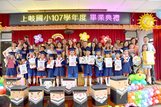 烈嶼鄉上岐國小昨舉行畢業典禮,在離情依依的互道珍重下,畢業生邁向人生的另一階段。典禮簡單而隆重,場面溫馨。 上岐國小昨於學校禮堂舉行國小部第54屆及幼兒園部第42屆畢業典禮,教育處副處長陳家輝、烈嶼鄉鄉長洪若珊、鄉代會主席方駿洋、副主席吳福全、代表林長征、陳秀治、烈嶼國中校長林永進、卓環國小校長余鳴、西口國小校長蔡志隆、前校長謝華東、家長會會長洪育政、慈幼會會長余平禧……等人出席,勉勵畢業生在未來能主動積極地學習,能有良好正面的態度,正向思考、學習成長。 上岐國小校長薛奕龍表示,一年前自前校長謝華東手中接過校長一職,自感責任重大,在畢業典禮的現在,以三點勉勵在座的學生:一、多元學習。學校在陶藝、書畫、游泳、長跑、樂樂棒球、大鼓、烏克麗麗等方面都發展得很好,期勉學生在每一樣學習裡找到自己的才華、自信及舞台,日後可繼續投資在這上面;二、養成閱讀的習慣。利用時間自學,投資在學習的時間越多,未來的成就就會不一樣;三、感恩惜福。今年來自各界的獎助學金非常的多,希望畢業生善用得到的獎學金。 鄉長洪若珊表示多元的教育學習需要大家的付出和努力,除稱許薛校長為地區教育加分外,也感謝學校老師的付出,並指出今年二至三歲幼小班將在上岐國小試辦,此舉對於地區的家長是很大的福音,未來烈嶼鄉計畫將在西方社區活動中心成立零至十二歲的公共托育中心,為這年齡段的教育邁出大大的一步。 來賓應邀頒發畢業生個人績優獎、小鐵人獎、金頭腦獎、全縣英語單字成就評量優秀獎等獎項。另外,烈嶼慈幼會、洪成發議員、咪兒民宿也提供獎學金給表現優異的畢業生;學生家長會頒發特別獎,受獎人正好是家長會長的女兒,父女倆在台上的互動令台下會心一笑。 在校生獻上祝福、畢業生發表感性的畢業感言之後,由校長頒發畢業證書,祝畢業生一帆風順、前程似錦。畢業典禮的後半段活動中也呈現了小朋友的才藝聯歡表演,每一班的在校生輪番登台,表達對學長、學姊的祝福,天真無邪的話語,增添活動的溫馨氛圍。午間,全校師生和來賓、家長一起在校園享用學校午餐,薛奕龍感謝各界的支持,讓上岐發展學校的特色教育。