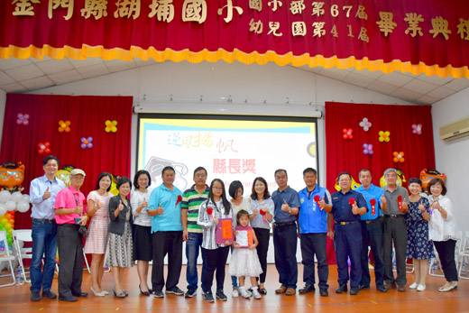 金寧鄉湖埔國小昨日舉行一○八級畢業典禮,六位國小部畢業生以及十四位幼兒園畢業生在校長、老師、家長的祝福下,畢業展開另一階段的學習旅程。校長蔡玉羨勉勵每位畢業生在人生學習的旅途中要不斷學習,強調要學會自主,學會做事,學會改變,要自覺主動積極的學習,才能度過各項難關,邁向成功之路。 湖埔國小一○八級畢業典禮暨聯歡活動於昨日上午九時起在湖埔國小學生活動中心舉行,由校長蔡玉羨主持,縣府教育處督學李卓恩、議員楊永立(校友會理事長),港務處長何佩舉以及金寧鄉長楊忠俊、鄉代會副主席楊水信、金門高中校長廖俊仁、寧中小校長陳雅蘭、金城國中退休校長楊瑞松,國小校長蔡雪芳、黃芸芸、曾秀玲及城幼園長許碧華等以及家長會會長楊秀清及委員、學生家長等貴賓到場,一同祝福畢業生鵬程萬里。 昨日典禮現場,與會貴賓應邀頒發縣長獎以及各項領域上表現優秀的學生獎品與獎狀並向畢業生表達祝福之意,家長也上台合照分享孩子成長的喜悅。現場並穿插民俗技藝跳繩表演,還有在校生精彩的民俗舞蹈表演,場面相當熱絡溫馨。