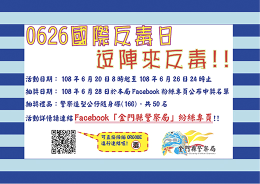 為因應行政院反毒宣導策略,加強民眾認識「0626國際反毒日」宣導議題,金門縣警察局將於國際反毒日前夕,透過社群網站(Facebook)傳播之力量,辦理網路宣導及抽獎活動,以提高民眾對於反毒意識之認知。 金門縣警察局為提升民眾對反毒意識之認知,將結合內政部警政署邀請空手道國手-文姿云小姐公益代言反毒訪談短片,於108年6月20日至6月29日刊載於金門縣警察局Facebook粉絲專頁,供大家點閱瀏覽。歡迎大朋友、小朋友一起參與這項Facebook粉絲專頁按讚及公開分享貼文活動。 本次活動,金門縣警察局將提供「Q版警察公仔造型隨身碟(16G)」50組給參加者抽獎,其活動方式如下:(1)邀請民眾至金門縣警察局Facebook粉絲專頁按「讚」並設定為「搶先看」。(2)針對金門縣警察局於Facebook粉絲專頁張貼之「國際反毒日」影片宣導活動頁面按「讚」,並於留言處「『0626國際反毒日』標記3名好友+請跟我一起拒絕毒品!」。(範例:「0626國際反毒日」王小明、陳小華、李小花請跟我一起拒絕毒品!)。(3)將金門縣警察局於Facebook粉絲專頁張貼之本活動頁面「公開」分享於個人Facebook專頁,以上三項均完成者,即可獲得抽獎資格。金門縣警察局將於108年6月28日下午14時,於該局Facebook粉絲專頁公布中獎名單。 「毒品防制」為本縣治安的重點工作之一,毒品不僅會危害身心,也可能會毀掉一個家庭。因此,金門縣警察局除了加強反毒宣導外,大家更應有反毒意識,傳遞正確反毒觀念,使全民遠離毒品。金門縣警察局局長張國雄也提出呼籲,請家長們多注意自己的子女生活狀況,也請適時陪伴子女從事休閒或是體育活動,給孩子一個平安、快樂、有意義的成長環境。