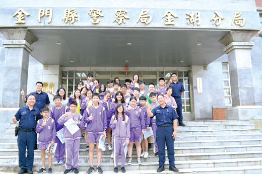 金湖國中配合生涯發展教育「參觀工作世界」教學主題,將上課教室移往金湖分局,在分局內經由各單位員警協助導覽解說,參觀金湖派出所、偵訊室、拘留所等處所,體驗警察日常工作的點滴。 金湖國中師生一行八十餘人,分三梯次由師長帶隊前往金湖分局進行校外參觀,受到勤務指揮中心主任呂世注及所屬同仁的歡迎,現場準備平日執勤的裝備如警槍、手銬、辣椒水、警棍、無線電等讓小朋友體驗,並準備了交通、婦幼安全、犯罪預防常識等有獎問答活動,透過組長廖建棠、偵查隊隊長林練雄及二組教官呂英達的講解,灌輸小朋友正確的法治觀念及交通安全知識。 活動中,金湖分局也以宣導小禮物致贈給小朋友作紀念,讓他們吸收到相關有用的資訊,開心結束學習之旅。 金湖分局分局長黃維章表示,非常歡迎學生到警察機關參訪,除了可以讓學子了解警察勤務,也希望強化守法觀念並向下扎根,逐步影響父母親,共創美好金門。